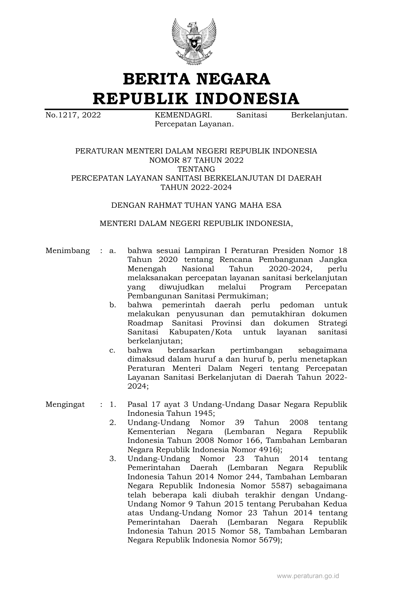 PERMEN Nomor 87 Tahun 2022 | Peraturan Menteri Nomor 87 Tahun 2022 tentang PERCEPATAN LAYANAN SANITASI BERKELANJUTAN DI DAERAH TAHUN 2022-2024