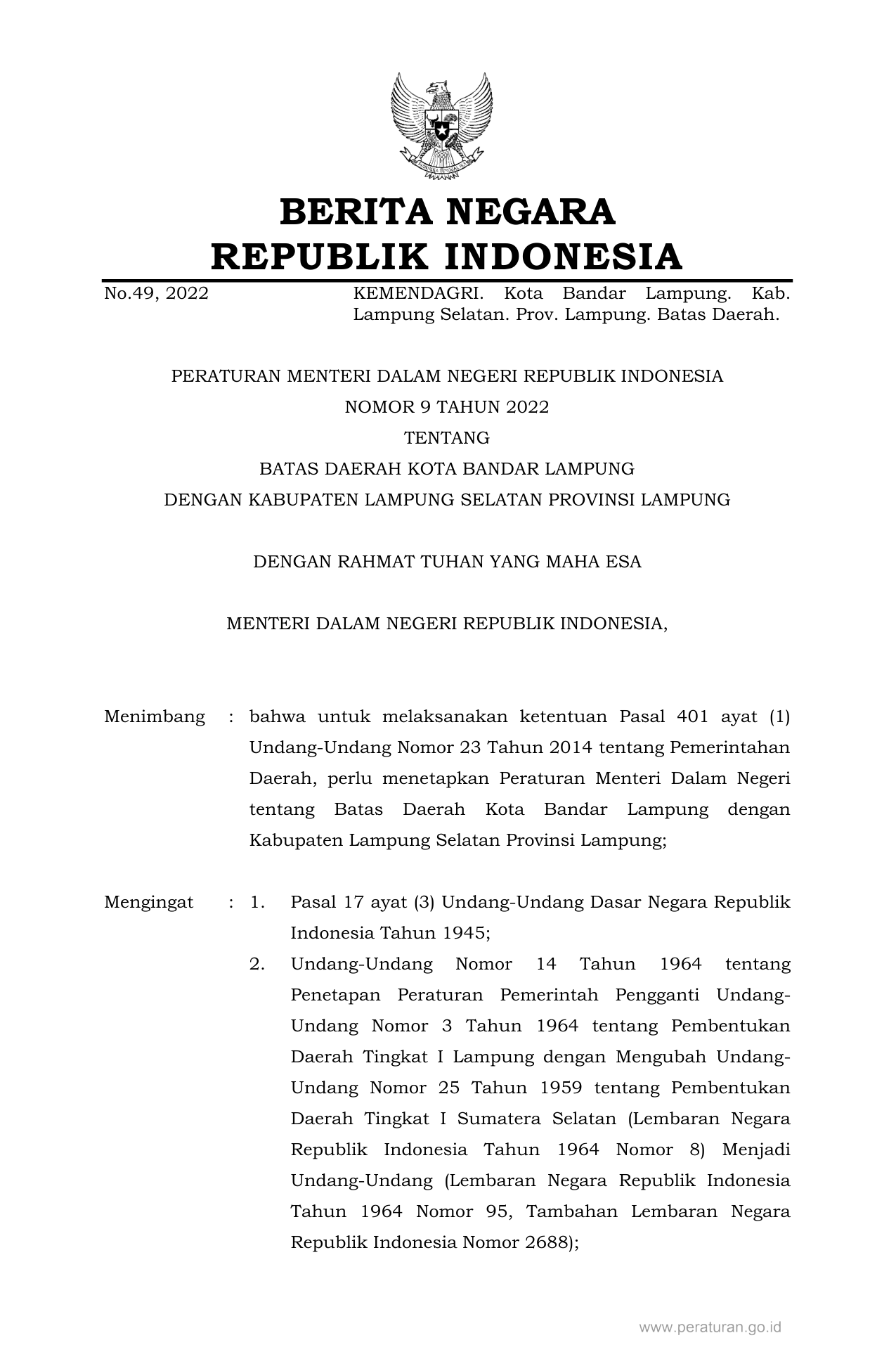 PERMEN Nomor 9 Tahun 2022 | Peraturan Menteri Nomor 9 Tahun 2022 tentang BATAS DAERAH KOTA BANDAR LAMPUNG DENGAN KABUPATEN LAMPUNG SELATAN PROVINSI LAMPUNG