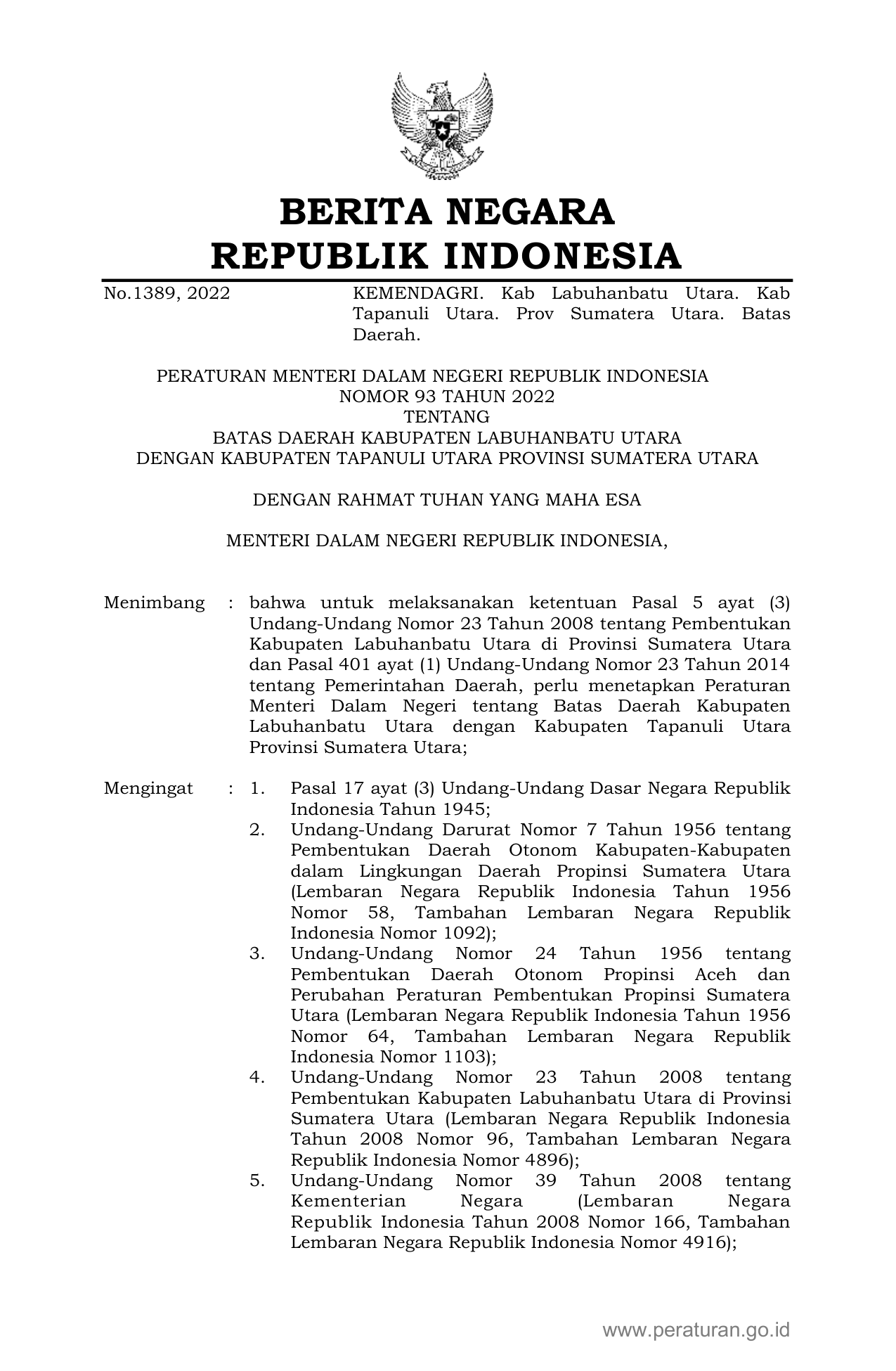 PERMEN Nomor 93 Tahun 2022 | Peraturan Menteri Nomor 93 Tahun 2022 tentang BATAS DAERAH KABUPATEN LABUHANBATU UTARA DENGAN KABUPATEN TAPANULI UTARA PROVINSI SUMATERA UTARA
