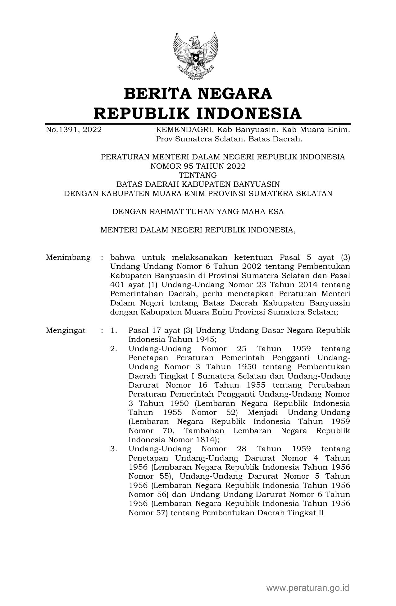 PERMEN Nomor 95 Tahun 2022 | Peraturan Menteri Nomor 95 Tahun 2022 tentang BATAS DAERAH KABUPATEN BANYUASIN DENGAN KABUPATEN MUARA ENIM PROVINSI SUMATERA SELATAN