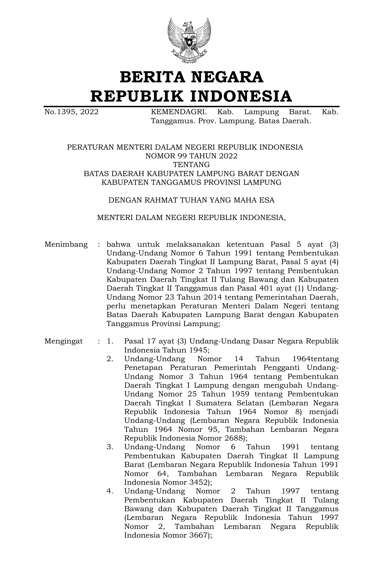 PERMEN Nomor 99 Tahun 2022 | Peraturan Menteri Nomor 99 Tahun 2022 tentang BATAS DAERAH KABUPATEN LAMPUNG BARAT DENGAN KABUPATEN TANGGAMUS PROVINSI LAMPUNG