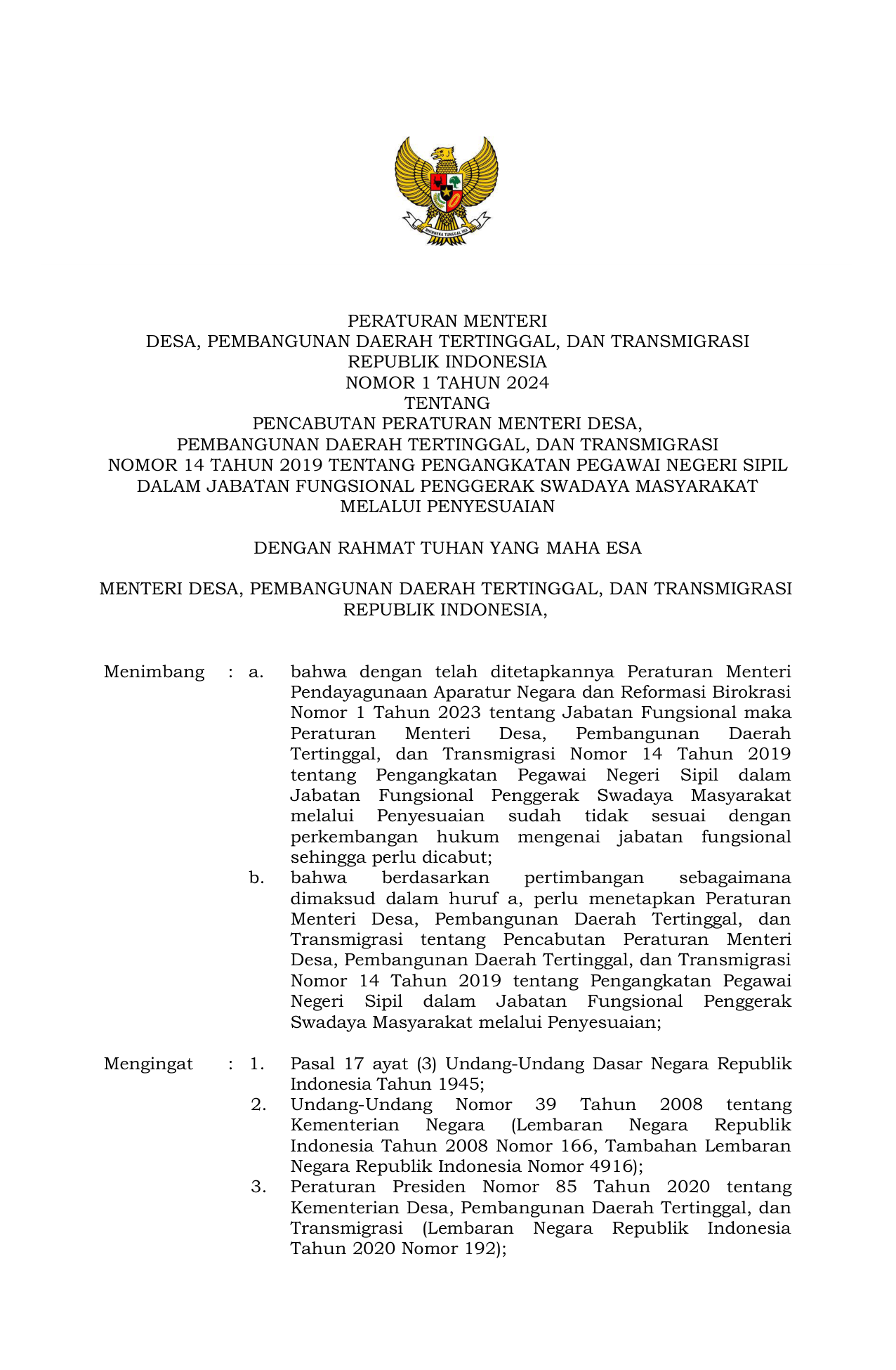 PERMEN Nomor 1 Tahun 2024 | Peraturan Menteri Nomor 1 Tahun 2024 tentang Pencabutan Peraturan Menteri Nomor 14 Tahun 2019 tentang Pengangkatan Pegawai Negeri Sipil Dalam Jabatan Fungsional Penggerak Swadaya Masyarakat
