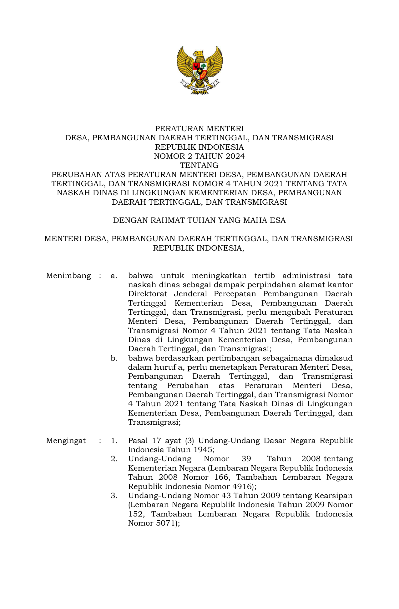 NOMOR 2 TAHUN 2024 TENTANG PERUBAHAN ATAS PERATURAN MENTERI DESA, PEMBANGUNAN DAERAH TERTINGGAL, DAN TRANSMIGRASI NOMOR 4 TAHUN 2021 TENTANG TATA NASKAH DINAS DI LINGKUNGAN KEMENTERIAN DESA, PEMBANGUNAN DAERAH TERTINGGAL, DAN TRANSMIGRASI