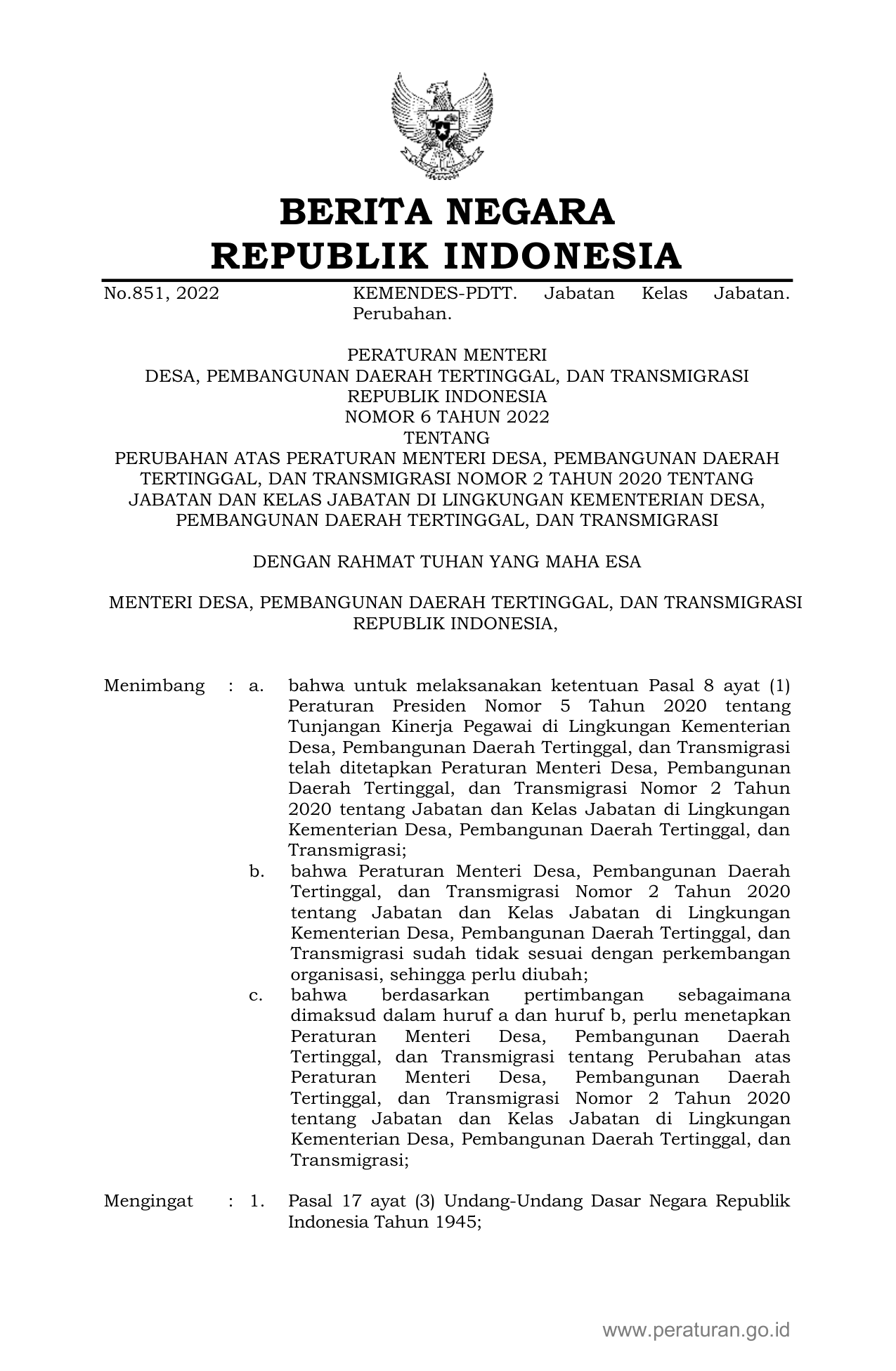PERMEN Nomor 6 Tahun 2022 | Peraturan Menteri Nomor 6 Tahun 2022 tentang PERUBAHAN ATAS PERATURAN MENTERI DESA, PEMBANGUNAN DAERAH TERTINGGAL, DAN TRANSMIGRASI NOMOR 2 TAHUN 2020 TENTANG JABATAN DAN KELAS JABATAN DI LINGKUNGAN KEMENTERIAN DESA, PEMBANGUNAN DAERAH TERTINGGAL, DAN TRANSMIGRASI