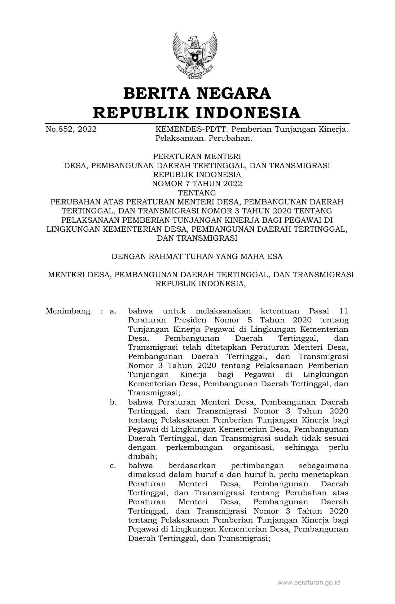 PERMEN Nomor 7 Tahun 2022 | Peraturan Menteri Nomor 7 Tahun 2022 tentang PERUBAHAN ATAS PERATURAN MENTERI DESA, PEMBANGUNAN DAERAH TERTINGGAL, DAN TRANSMIGRASI NOMOR 3 TAHUN 2020 TENTANG PELAKSANAAN PEMBERIAN TUNJANGAN KINERJA BAGI PEGAWAI DI LINGKUNGAN KEMENTERIAN DESA, PEMBANGUNAN DAERAH TERTINGGAL, DAN TRANSMIGRASI
