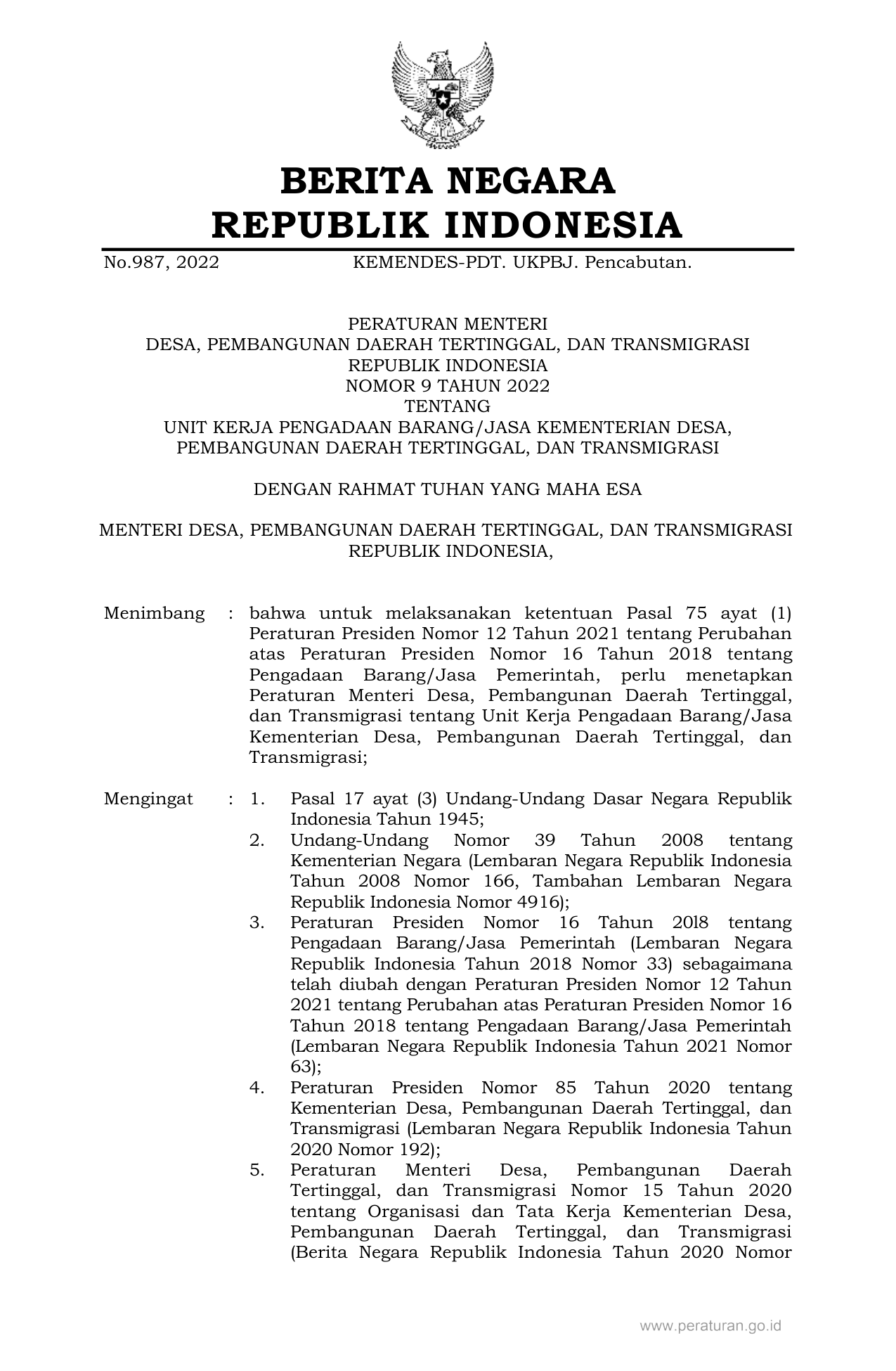 PERMEN Nomor 9 Tahun 2022 | Peraturan Menteri Nomor 9 Tahun 2022 tentang UNIT KERJA PENGADAAN BARANG/JASA KEMENTERIAN DESA, PEMBANGUNAN DAERAH TERTINGGAL, DAN TRANSMIGRASI