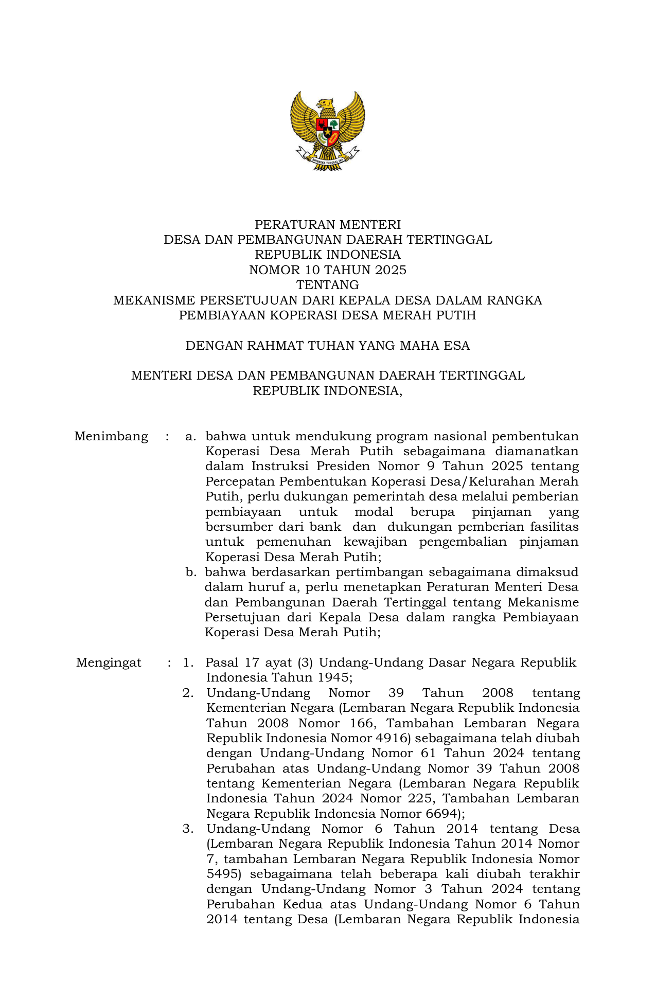 PERMEN Nomor 10 Tahun 2025 | Peraturan Menteri Nomor 10 Tahun 2025 tentang Mekanisme Persetujuan dari Kepala Desa dalam rangka Pembiayaan Koperasi Desa Merah Putih
