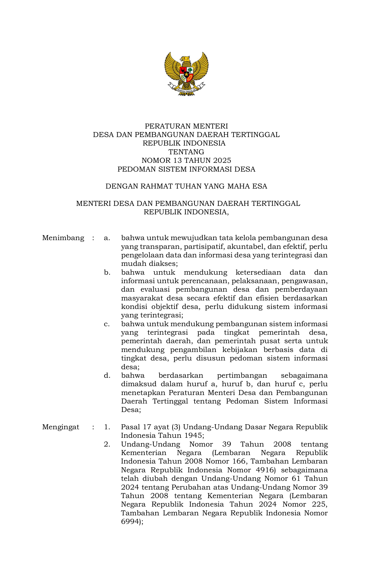 PERMEN Nomor 13 Tahun 2025 | Peraturan Menteri Nomor 13 Tahun 2025 tentang Pedoman Sistem Informasi Desa