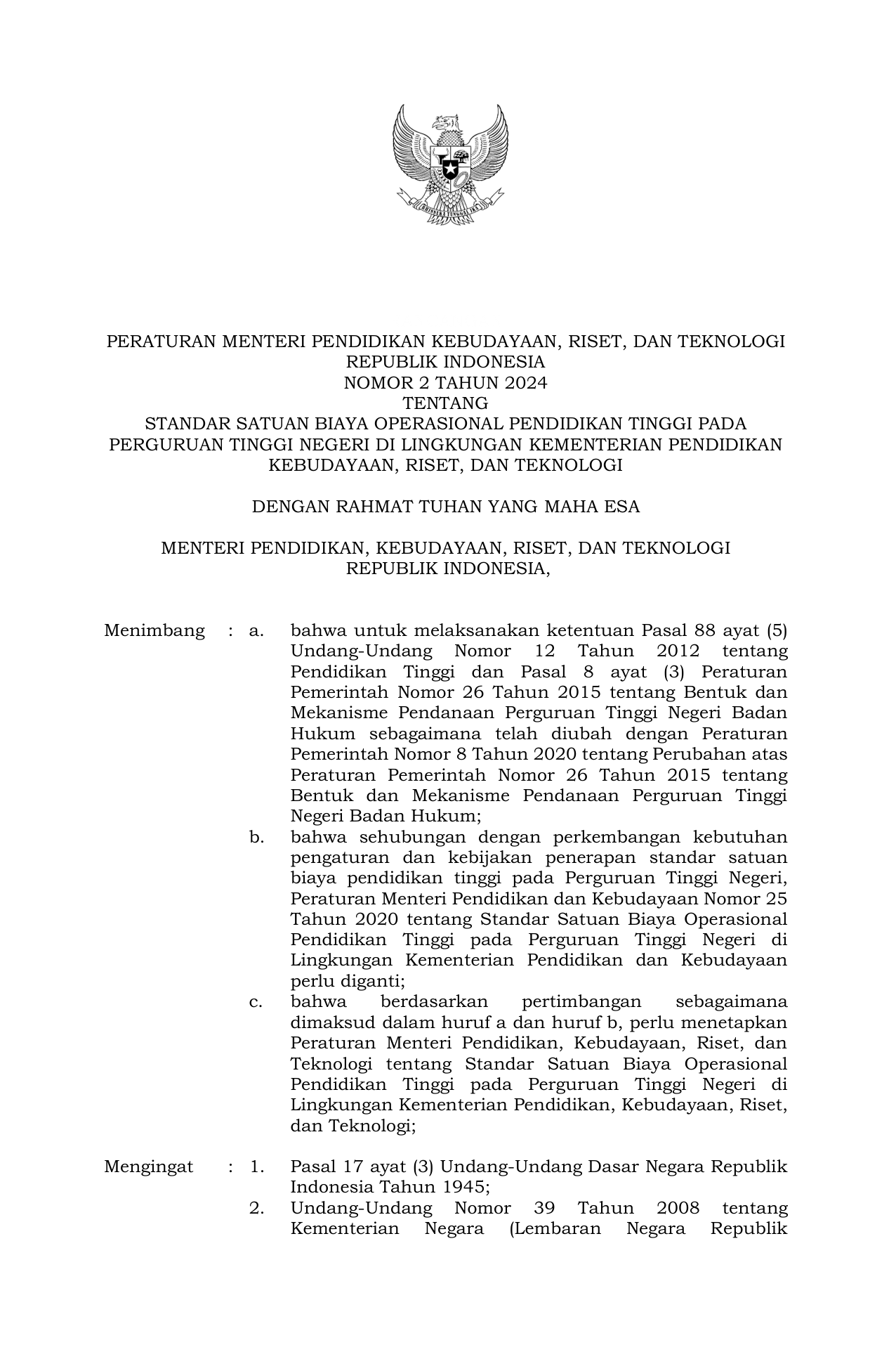 PERMEN Nomor 2 Tahun 2024 | Peraturan Menteri Nomor 2 Tahun 2024 tentang STANDAR SATUAN BIAYA OPERASIONAL PENDIDIKAN TINGGI PADA PERGURUAN TINGGI NEGERI DI LINGKUNGAN KEMENTERIAN PENDIDIKAN KEBUDAYAAN, RISET, DAN TEKNOLOGI