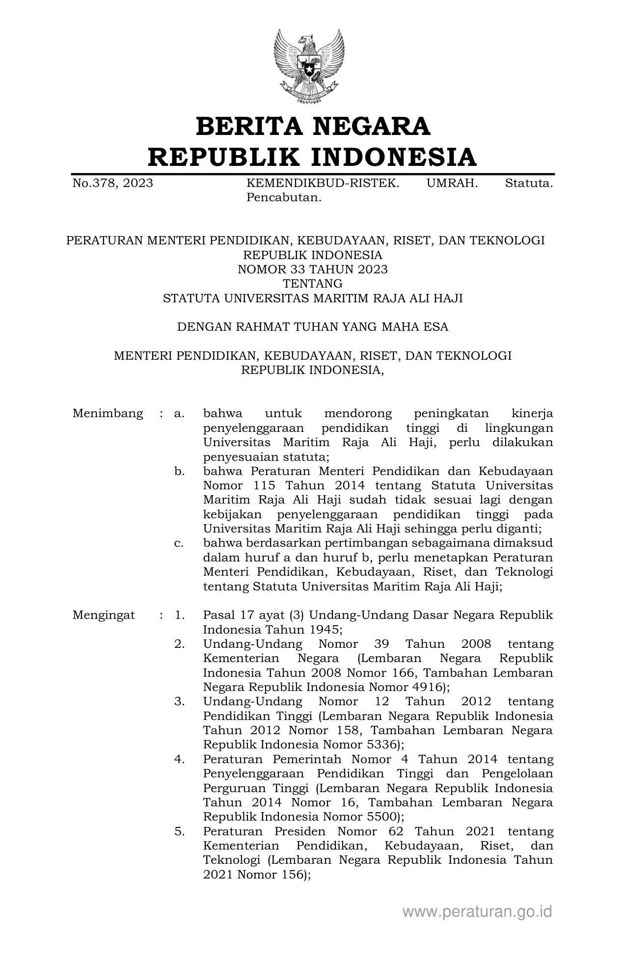 PERMEN Nomor 33 Tahun 2023 | Peraturan Menteri Nomor 33 Tahun 2023 tentang STATUTA UNIVERSITAS MARITIM RAJA ALI HAJI