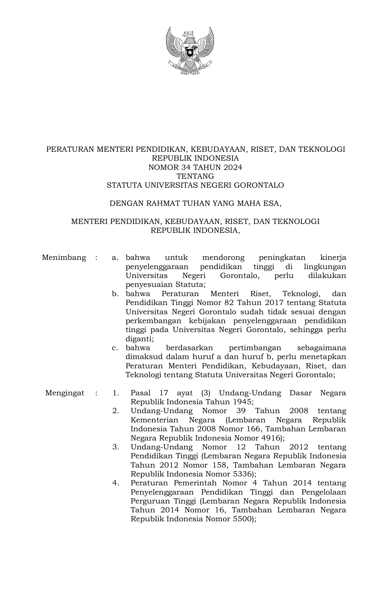 PERMEN Nomor 34 Tahun 2024 | Peraturan Menteri Nomor 34 Tahun 2024 tentang Statuta Universitas Negeri Gorontalo