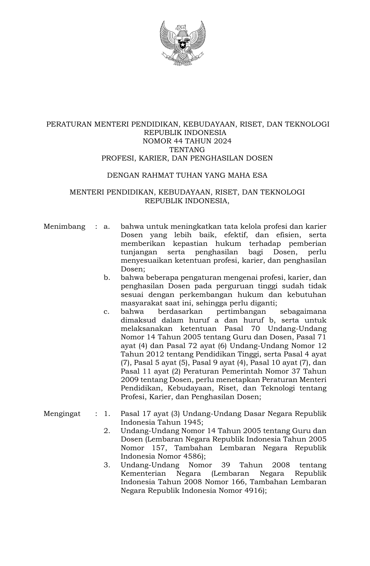 PERMEN Nomor 44 Tahun 2024 | Peraturan Menteri Nomor 44 Tahun 2024 tentang Profesi, Karier, dan Penghasilan Dosen