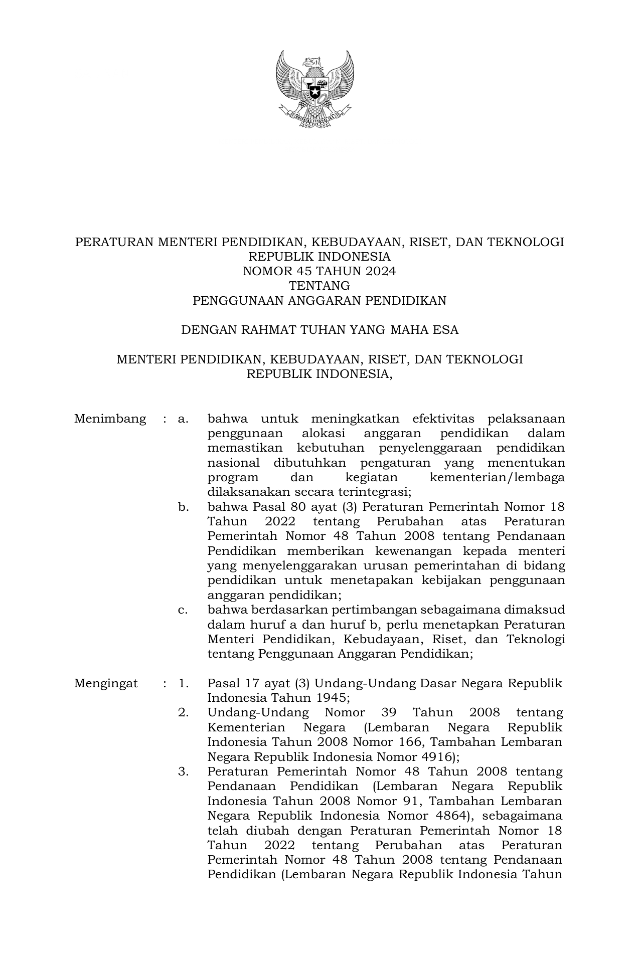 PERMEN Nomor 45 Tahun 2024 | Peraturan Menteri Nomor 45 Tahun 2024 tentang Penggunaan Anggaran Pendidikan