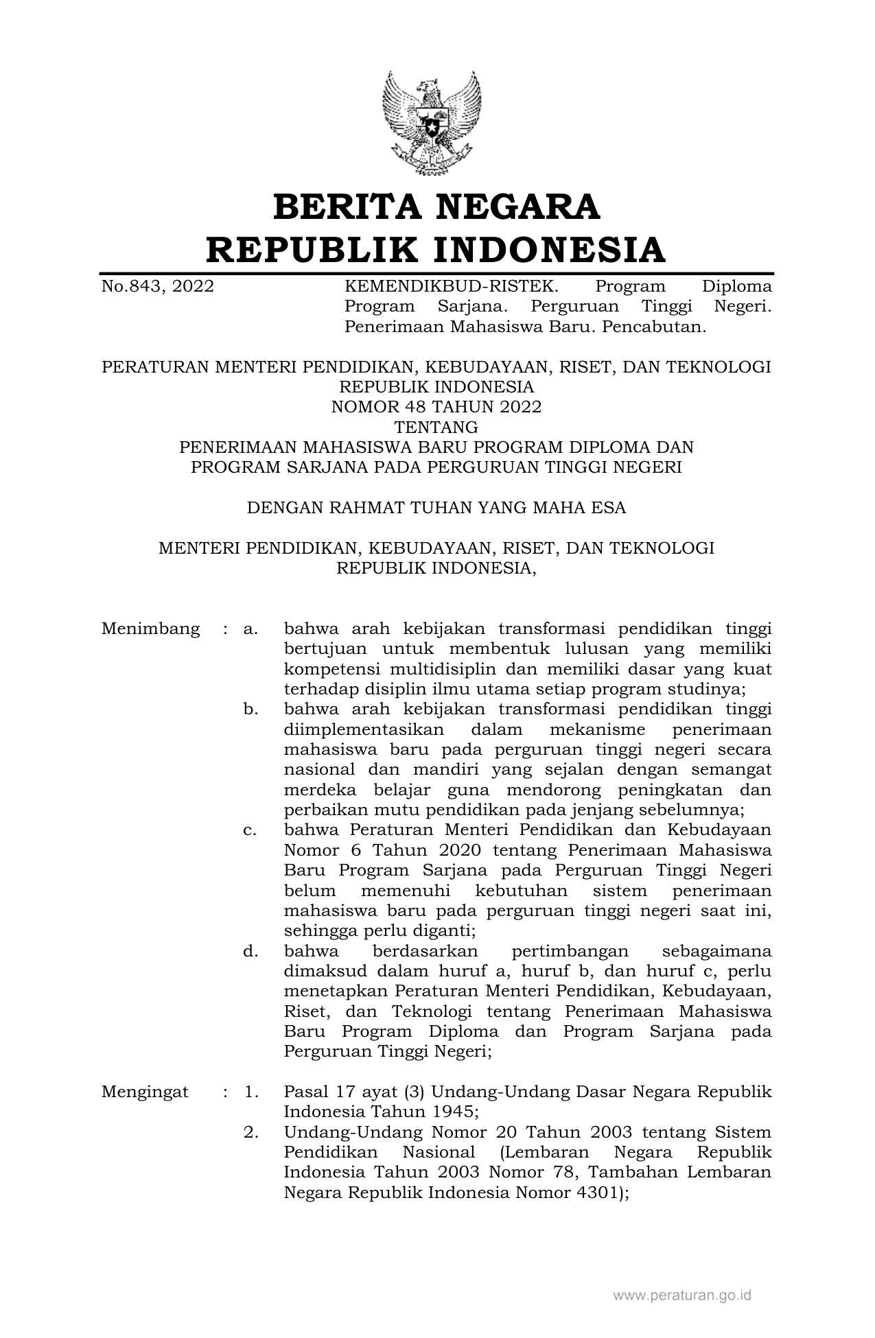 PERMEN Nomor 48 Tahun 2022 | Peraturan Menteri Nomor 48 Tahun 2022 tentang PENERIMAAN MAHASISWA BARU PROGRAM DIPLOMA DAN PROGRAM SARJANA PADA PERGURUAN TINGGI NEGERI