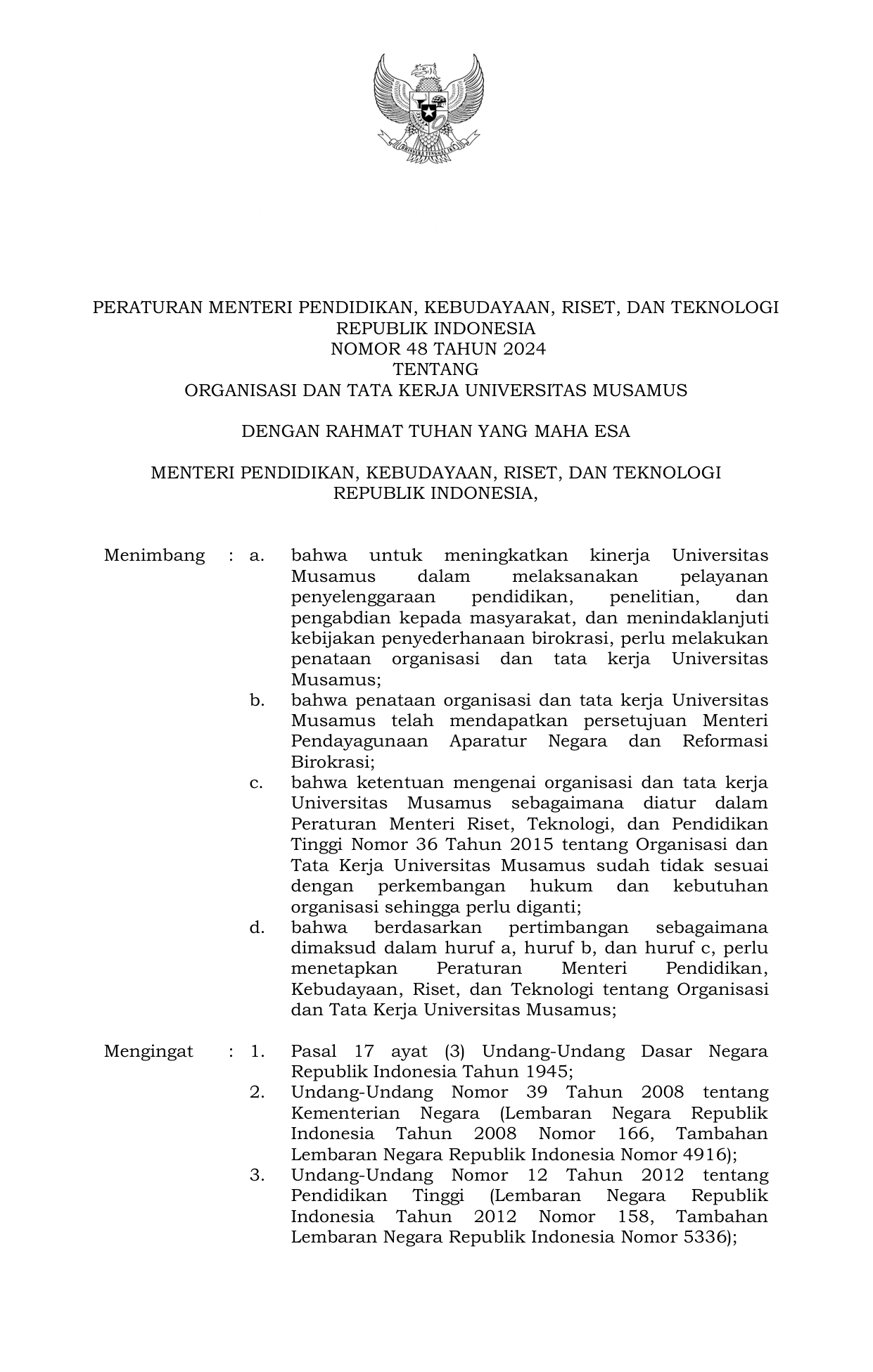 PERMEN Nomor 48 Tahun 2024 | Peraturan Menteri Nomor 48 Tahun 2024 tentang Organisasi dan Tata Kerja Universitas Musamus