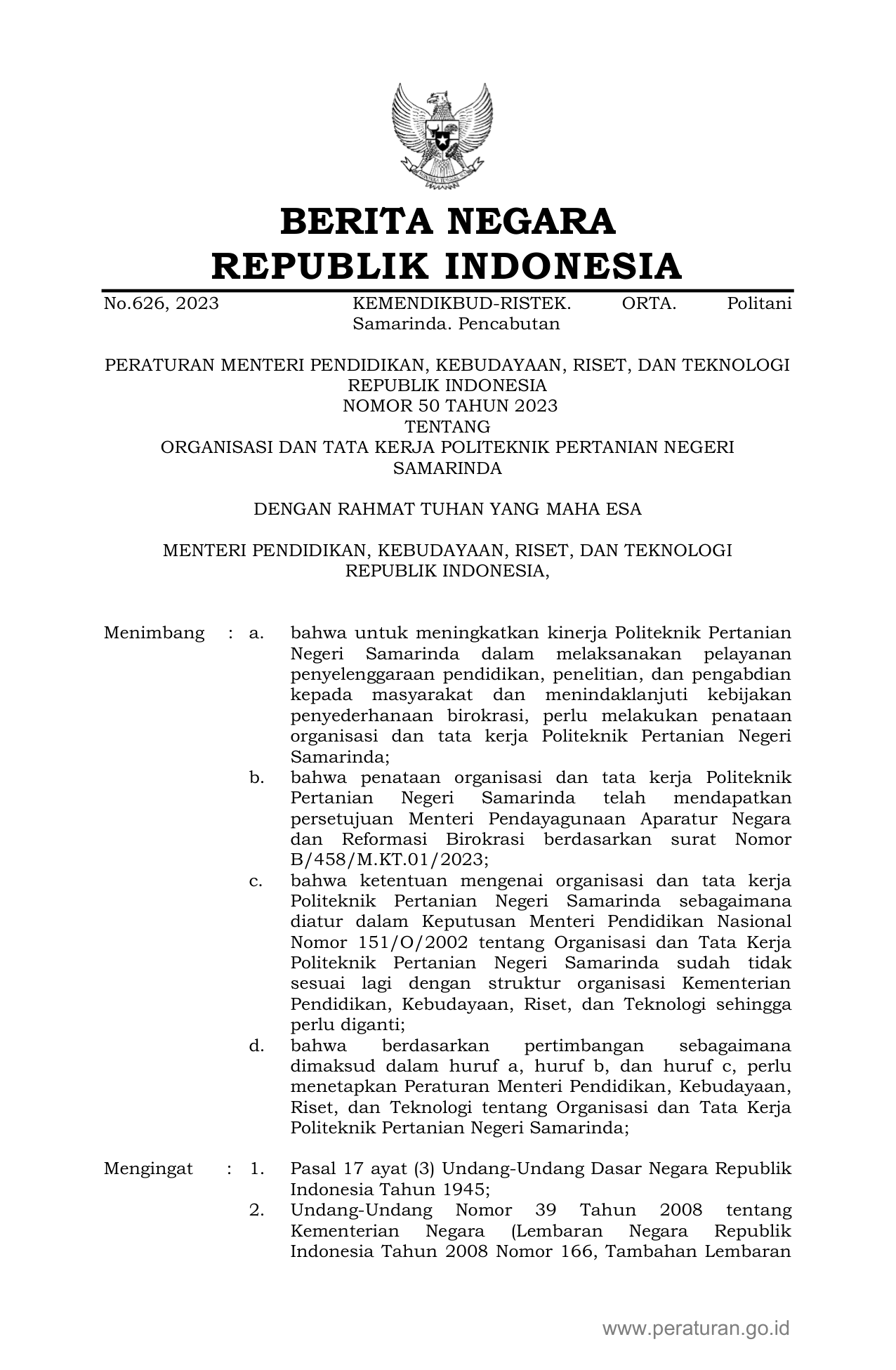 PERMEN Nomor 50 Tahun 2023 | Peraturan Menteri Nomor 50 Tahun 2023 tentang ORGANISASI DAN TATA KERJA POLITEKNIK PERTANIAN NEGERI SAMARINDA