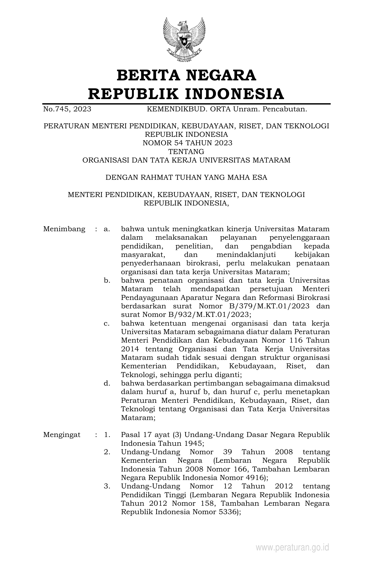 PERMEN Nomor 54 Tahun 2023 | Peraturan Menteri Nomor 54 Tahun 2023 tentang ORGANISASI DAN TATA KERJA UNIVERSITAS MATARAM