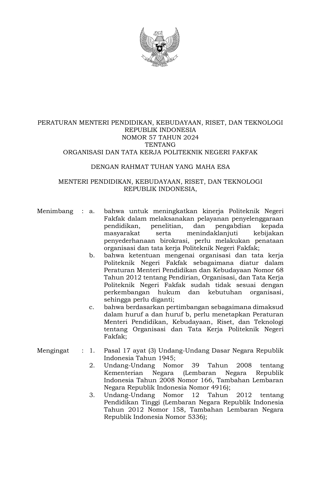 PERMEN Nomor 57 Tahun 2024 | Peraturan Menteri Nomor 57 Tahun 2024 tentang Organisasi dan Tata Kerja Politeknik Negeri Fakfak