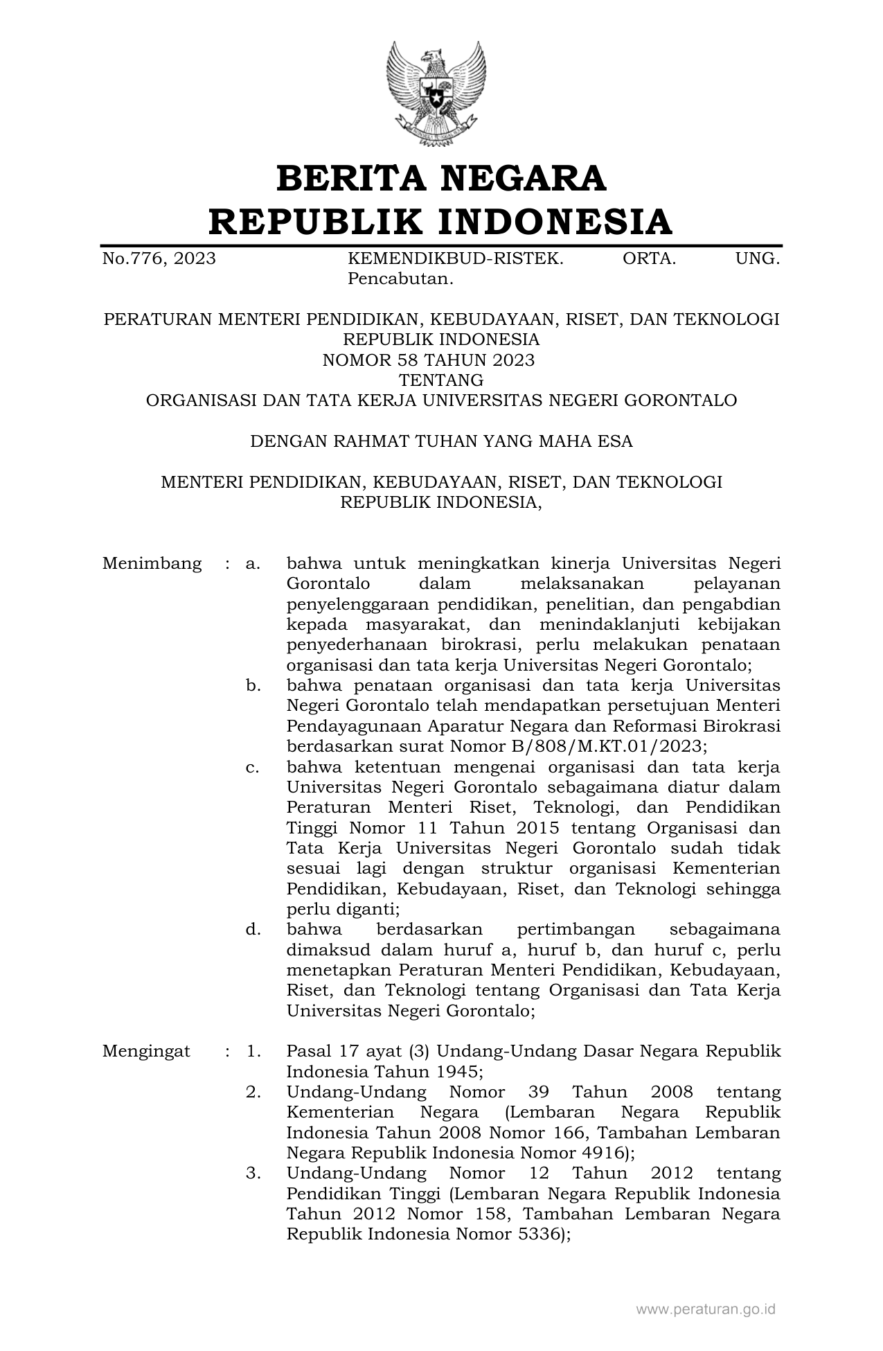 PERMEN Nomor 58 Tahun 2023 | Peraturan Menteri Nomor 58 Tahun 2023 tentang ORGANISASI DAN TATA KERJA UNIVERSITAS NEGERI GORONTALO
