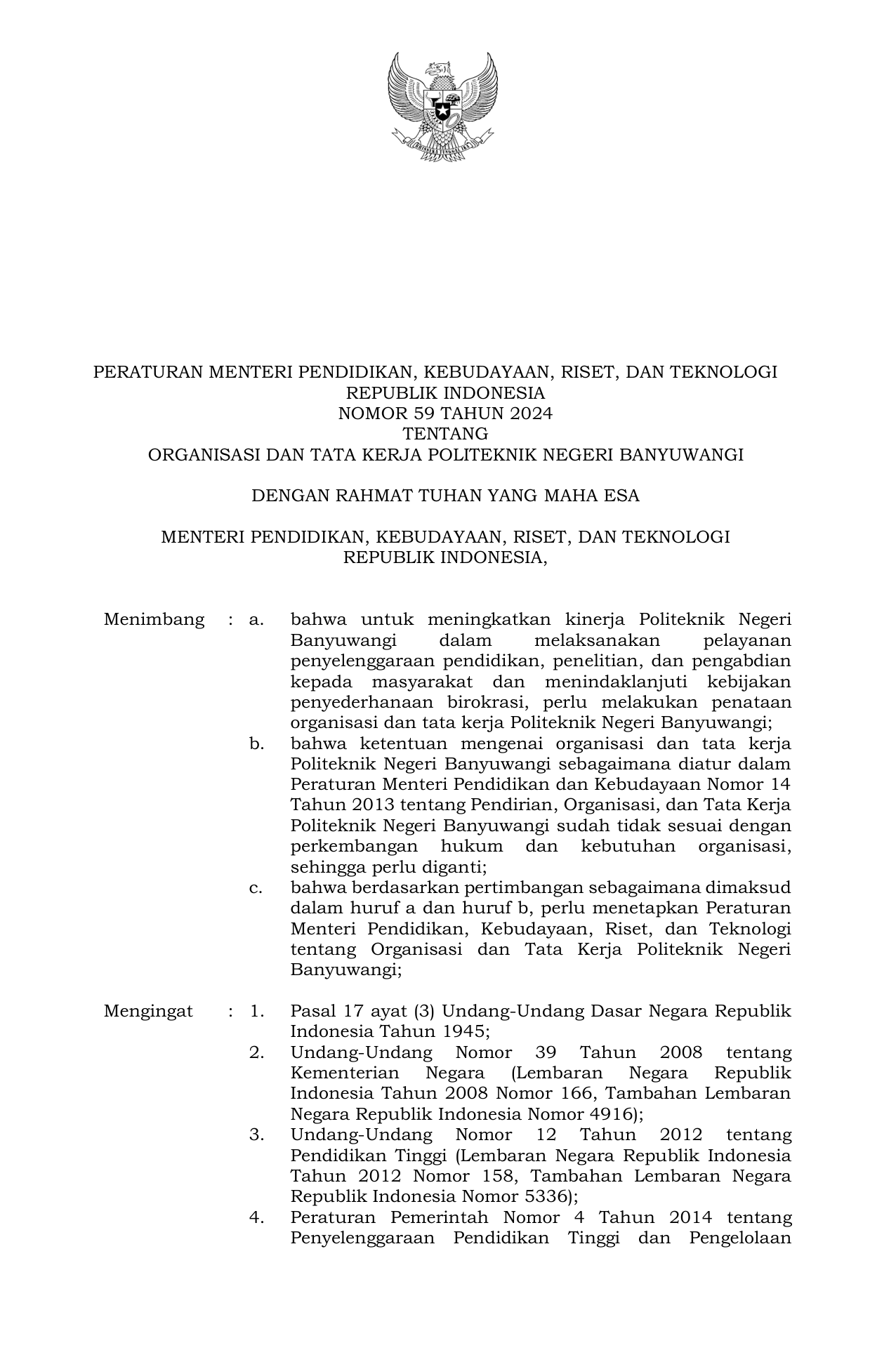 PERMEN Nomor 59 Tahun 2024 | Peraturan Menteri Nomor 59 Tahun 2024 tentang Organisasi dan Tata Kerja Politeknik Negeri Banyuwangi