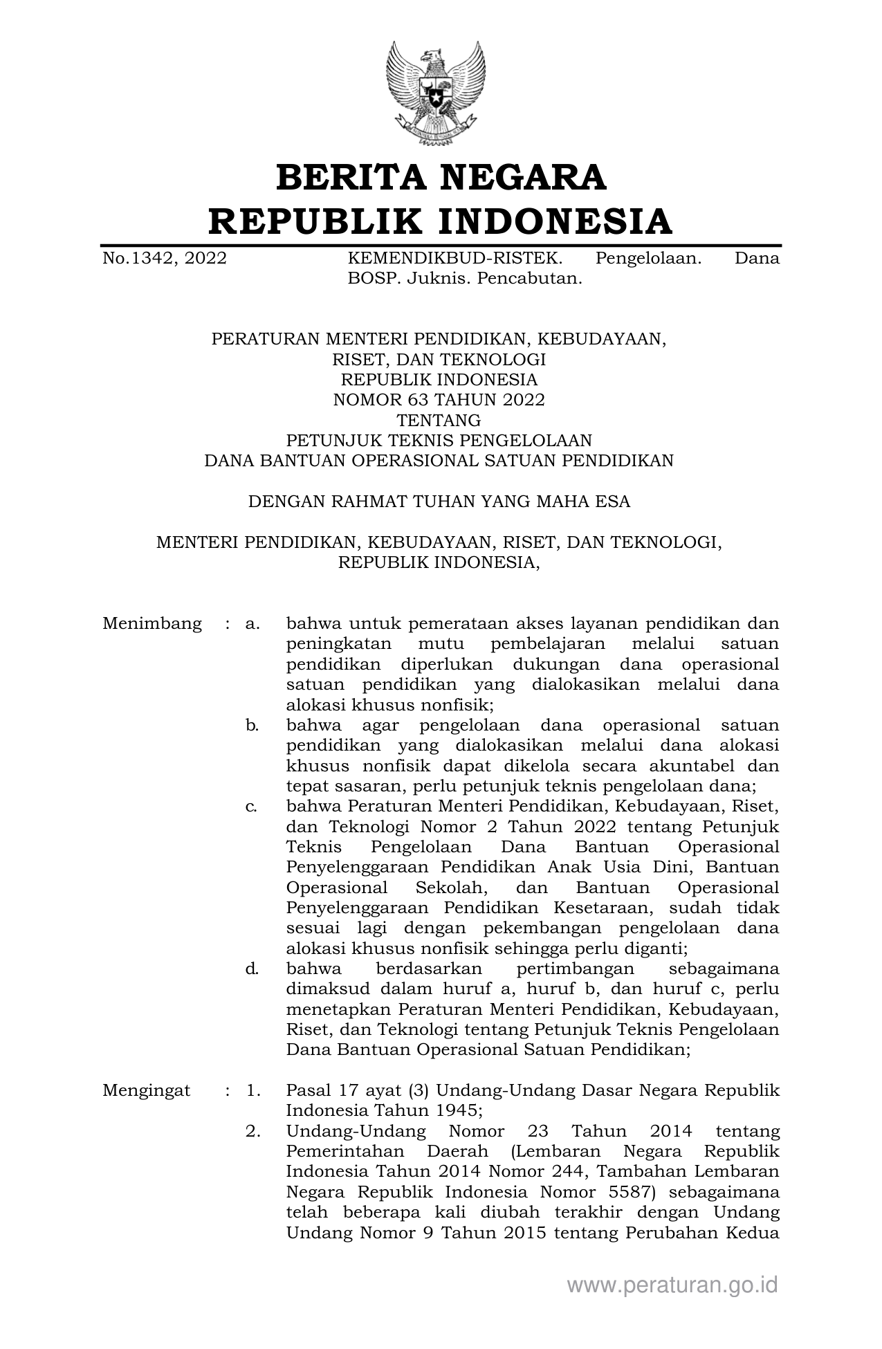 PERMEN Nomor 63 Tahun 2022 | Peraturan Menteri Nomor 63 Tahun 2022 tentang PETUNJUK TEKNIS PENGELOLAAN DANA BANTUAN OPERASIONAL SATUAN PENDIDIKAN