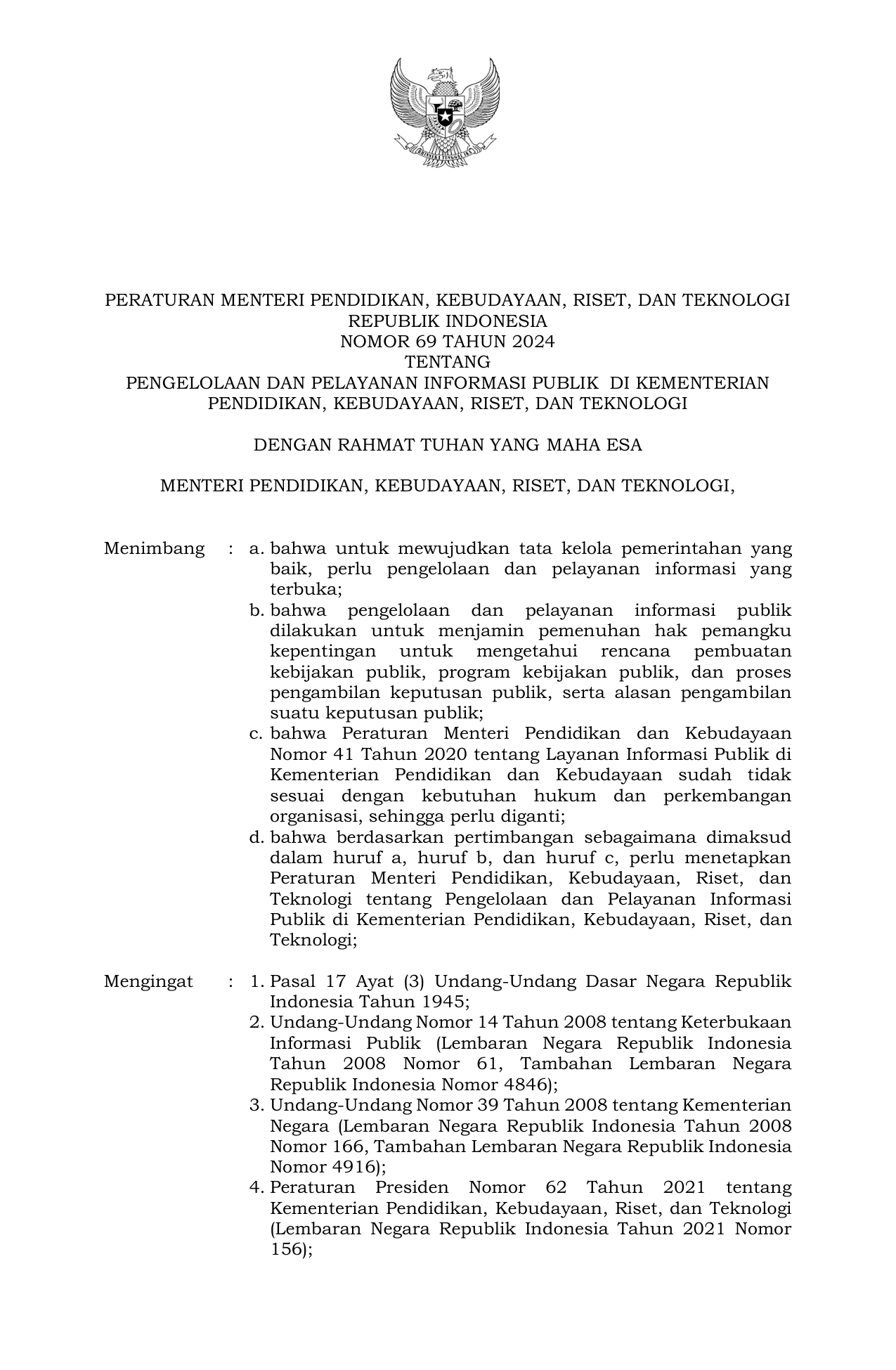 PERMEN Nomor 69 Tahun 2024 | Peraturan Menteri Nomor 69 Tahun 2024 tentang Pengelolaan dan Pelayanan Informasi Publik di Kementerian Pendidikan, Kebudayaan, Riset, dan Teknologi