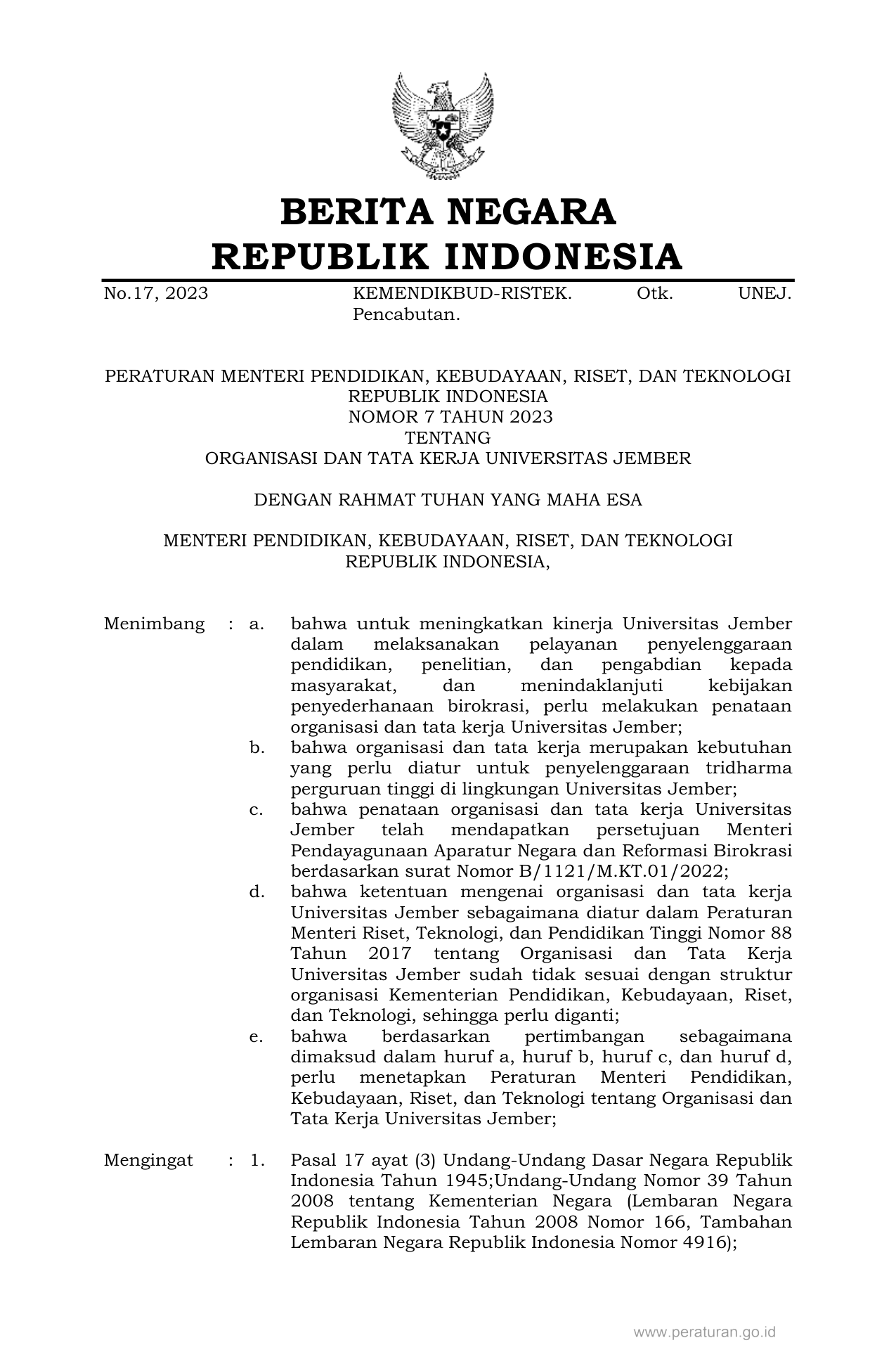 PERMEN Nomor 7 Tahun 2023 | Peraturan Menteri Nomor 7 Tahun 2023 tentang ORGANISASI DAN TATA KERJA UNIVERSITAS JEMBER