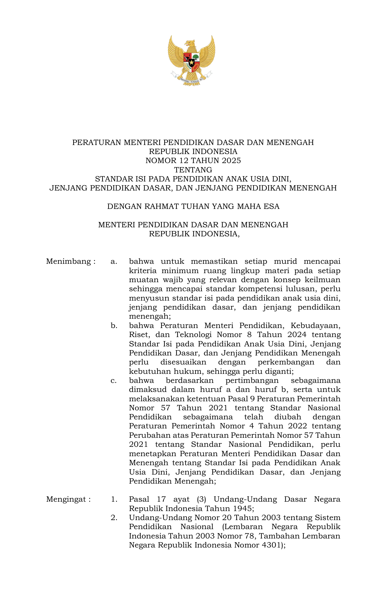 PERMEN Nomor 12 Tahun 2025 | Peraturan Menteri Nomor 12 Tahun 2025 tentang Standar Isi pada Pendidikan Anak Usia Dini Jenjang Pendidikan Dasar dan Jenjang Pendidikan Menengah