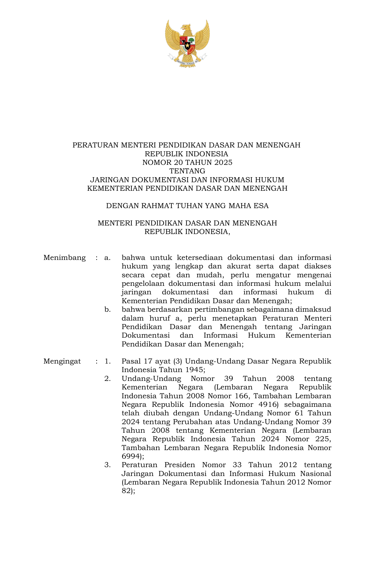 PERMEN Nomor 20 Tahun 2025 | Peraturan Menteri Nomor 20 Tahun 2025 tentang Jaringan Dokumentasi dan Informasi Hukum Kementerian Pendidikan Dasar dan Menengah