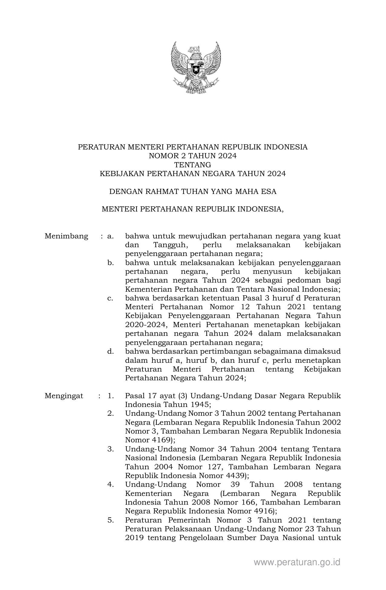 PERMEN Nomor 2 Tahun 2024 | Peraturan Menteri Nomor 2 Tahun 2024 tentang KEBIJAKAN PERTAHANAN NEGARA TAHUN 2024