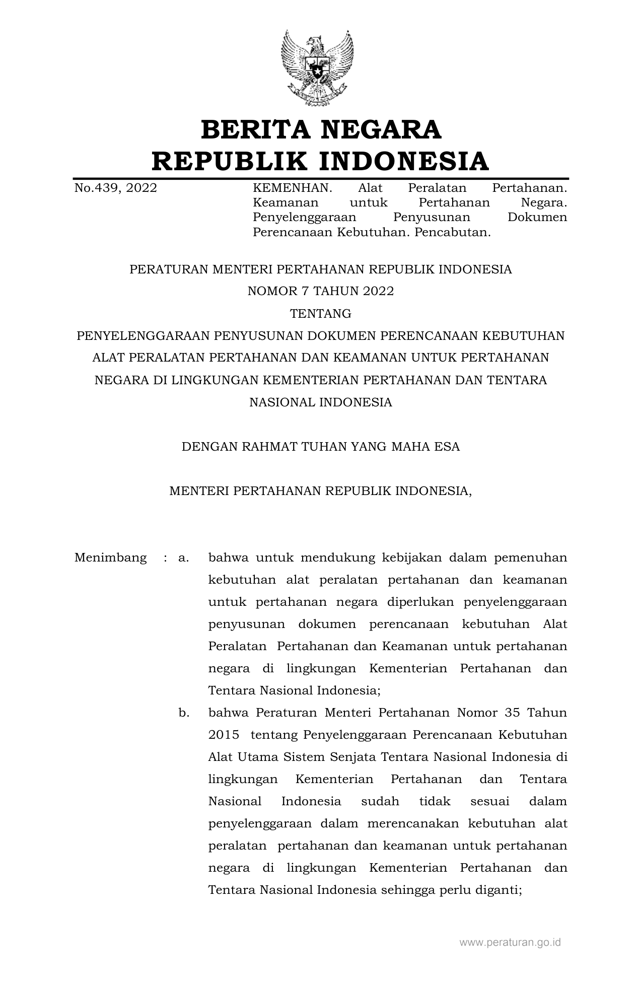 PERMEN Nomor 7 Tahun 2022 | Peraturan Menteri Nomor 7 Tahun 2022 tentang PENYELENGGARAAN PENYUSUNAN DOKUMEN PERENCANAAN KEBUTUHAN ALAT PERALATAN PERTAHANAN DAN KEAMANAN UNTUK PERTAHANAN NEGARA DI LINGKUNGAN KEMENTERIAN PERTAHANAN DAN TENTARA NASIONAL INDONESIA