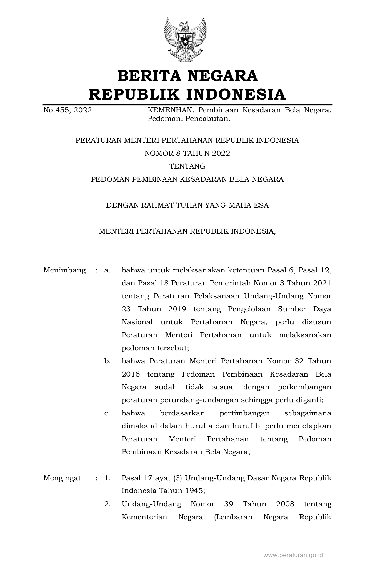 PERMEN Nomor 8 Tahun 2022 | Peraturan Menteri Nomor 8 Tahun 2022 tentang PEDOMAN PEMBINAAN KESADARAN BELA NEGARA