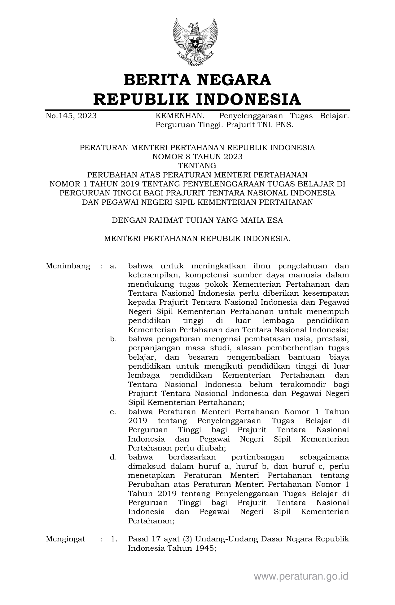 PERMEN Nomor 8 Tahun 2023 | Peraturan Menteri Nomor 8 Tahun 2023 tentang PERUBAHAN ATAS PERATURAN MENTERI PERTAHANAN NOMOR 1 TAHUN 2019 TENTANG PENYELENGGARAAN TUGAS BELAJAR DI PERGURUAN TINGGI BAGI PRAJURIT TENTARA NASIONAL INDONESIA DAN PEGAWAI NEGERI SIPIL KEMENTERIAN PERTAHANAN