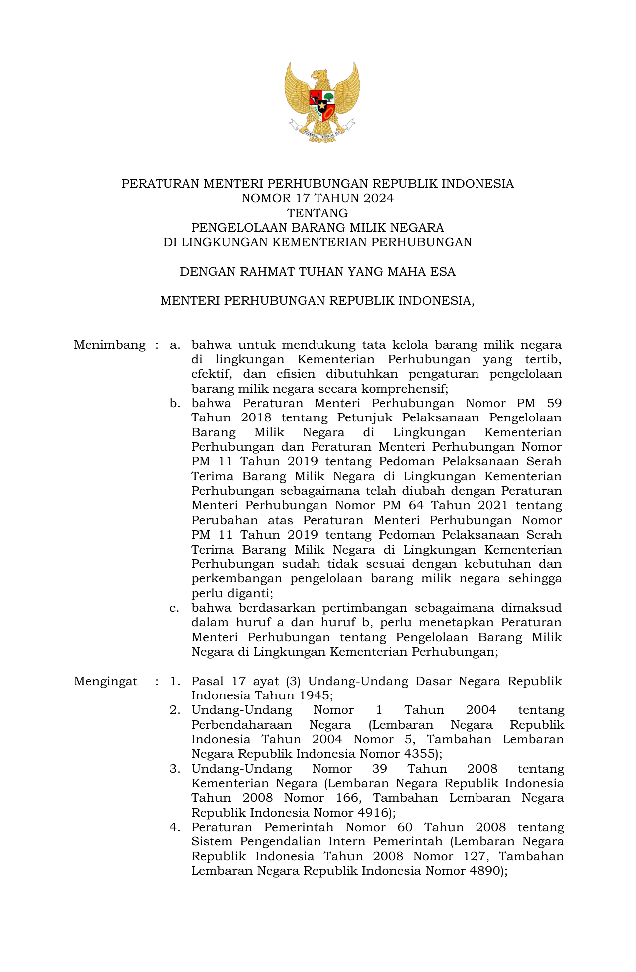 PERMEN Nomor 17 Tahun 2024 | Peraturan Menteri Nomor 17 Tahun 2024 tentang Pengelolaan Barang Milik Negara di Lingkungan Kementerian Perhubungan