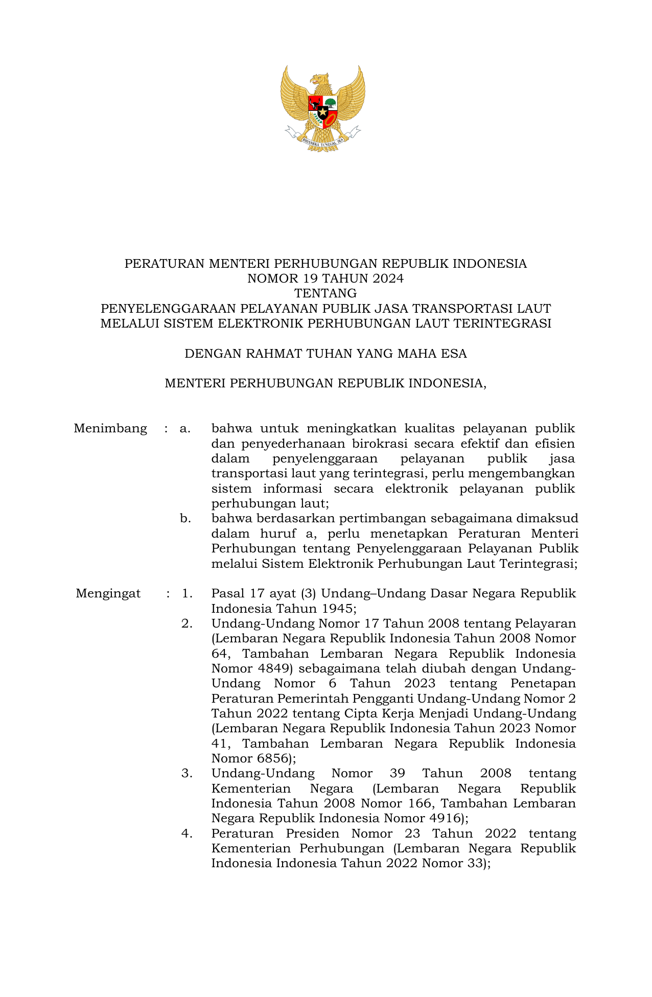 PERMEN Nomor 19 Tahun 2024 | Peraturan Menteri Nomor 19 Tahun 2024 tentang Penyelenggaraan Pelayanan Publik Jasa Transportasi Laut Melalui Sistem Elektronik Perhubungan Laut Terintegrasi