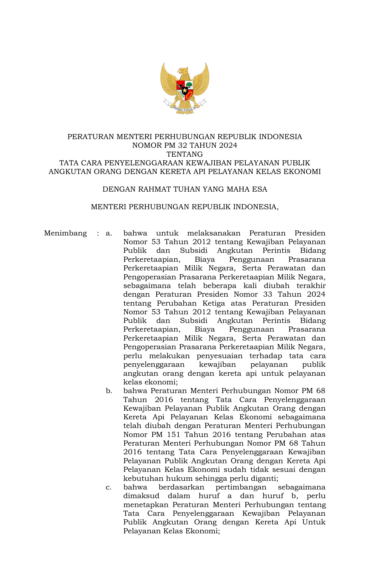 PERMEN Nomor 32 Tahun 2024 | Peraturan Menteri Nomor 32 Tahun 2024 tentang Tata Cara Penyelenggaraan Kewajiban Pelayanan Publik Angkutan Orang Dengan Kereta Api Pelayanan Kelas Ekonomi