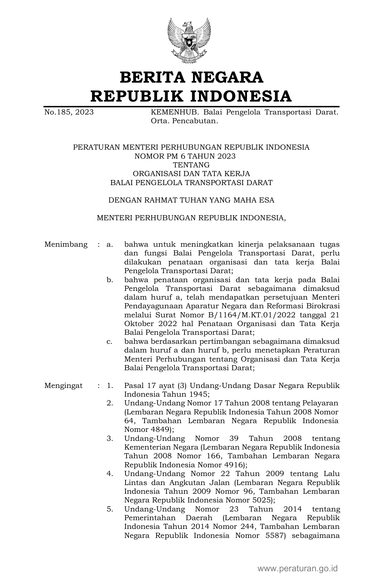 PERMEN Nomor 6 Tahun 2023 | Peraturan Menteri Nomor 6 Tahun 2023 tentang ORGANISASI DAN TATA KERJA BALAI PENGELOLA TRANSPORTASI DARAT