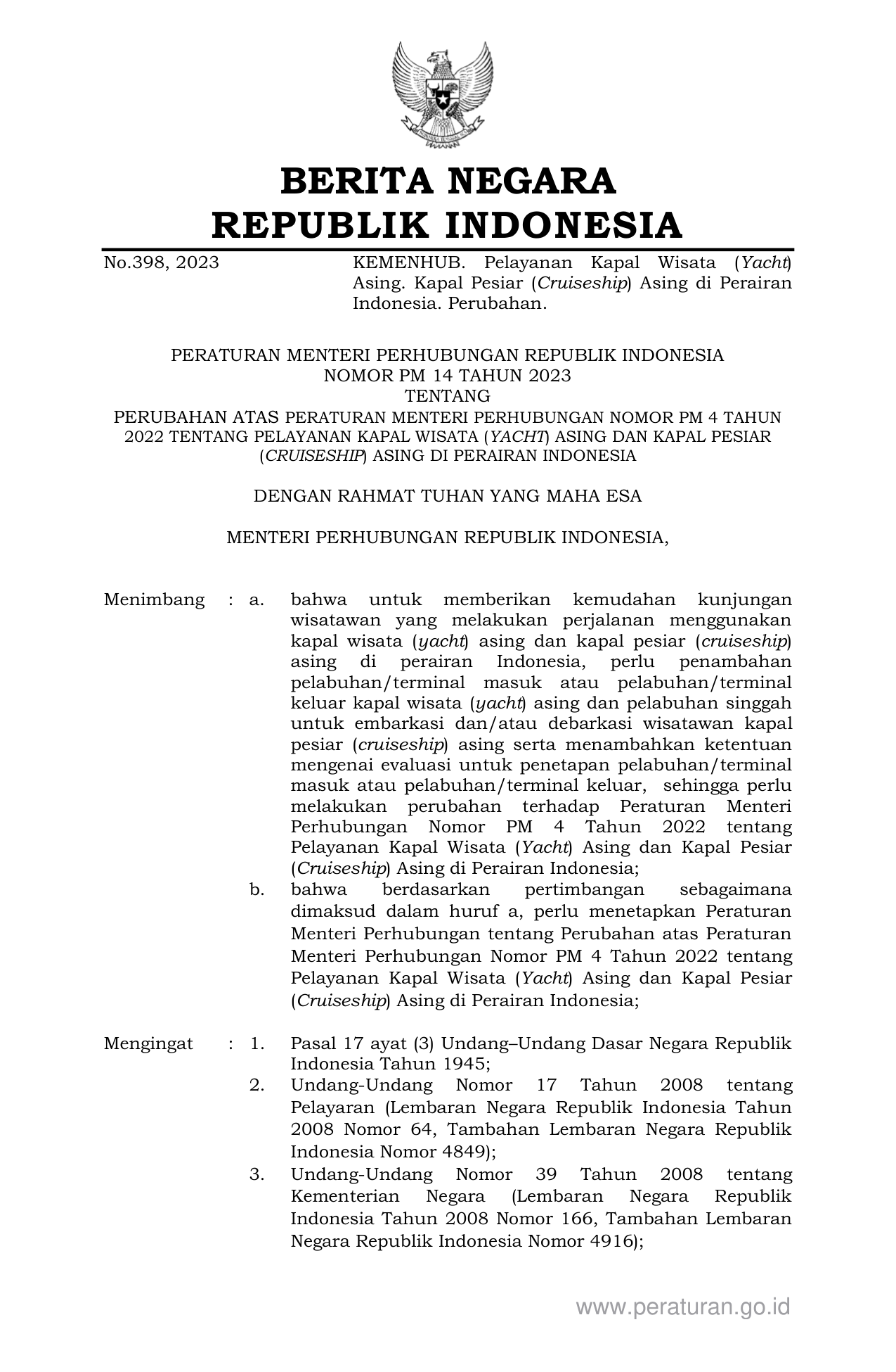 PERMEN Nomor pm-14 Tahun 2023 | Peraturan Menteri Nomor pm-14 Tahun 2023 tentang PERUBAHAN ATAS PERATURAN MENTERI PERHUBUNGAN NOMOR PM 4 TAHUN 2022 TENTANG PELAYANAN KAPAL WISATA (YACHT) ASING DAN KAPAL PESIAR (CRUISESHIP) ASING DI PERAIRAN INDONESIA
