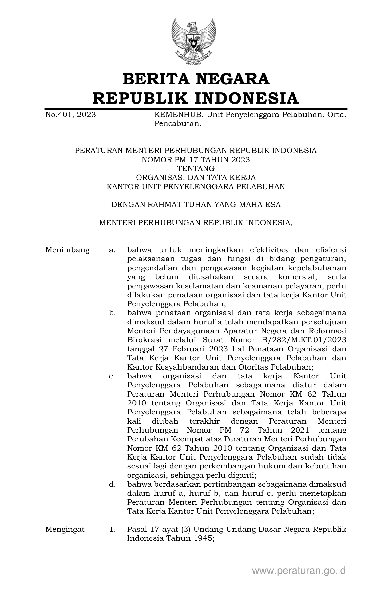 PERMEN Nomor pm-17 Tahun 2023 | Peraturan Menteri Nomor pm-17 Tahun 2023 tentang ORGANISASI DAN TATA KERJA KANTOR UNIT PENYELENGGARA PELABUHAN