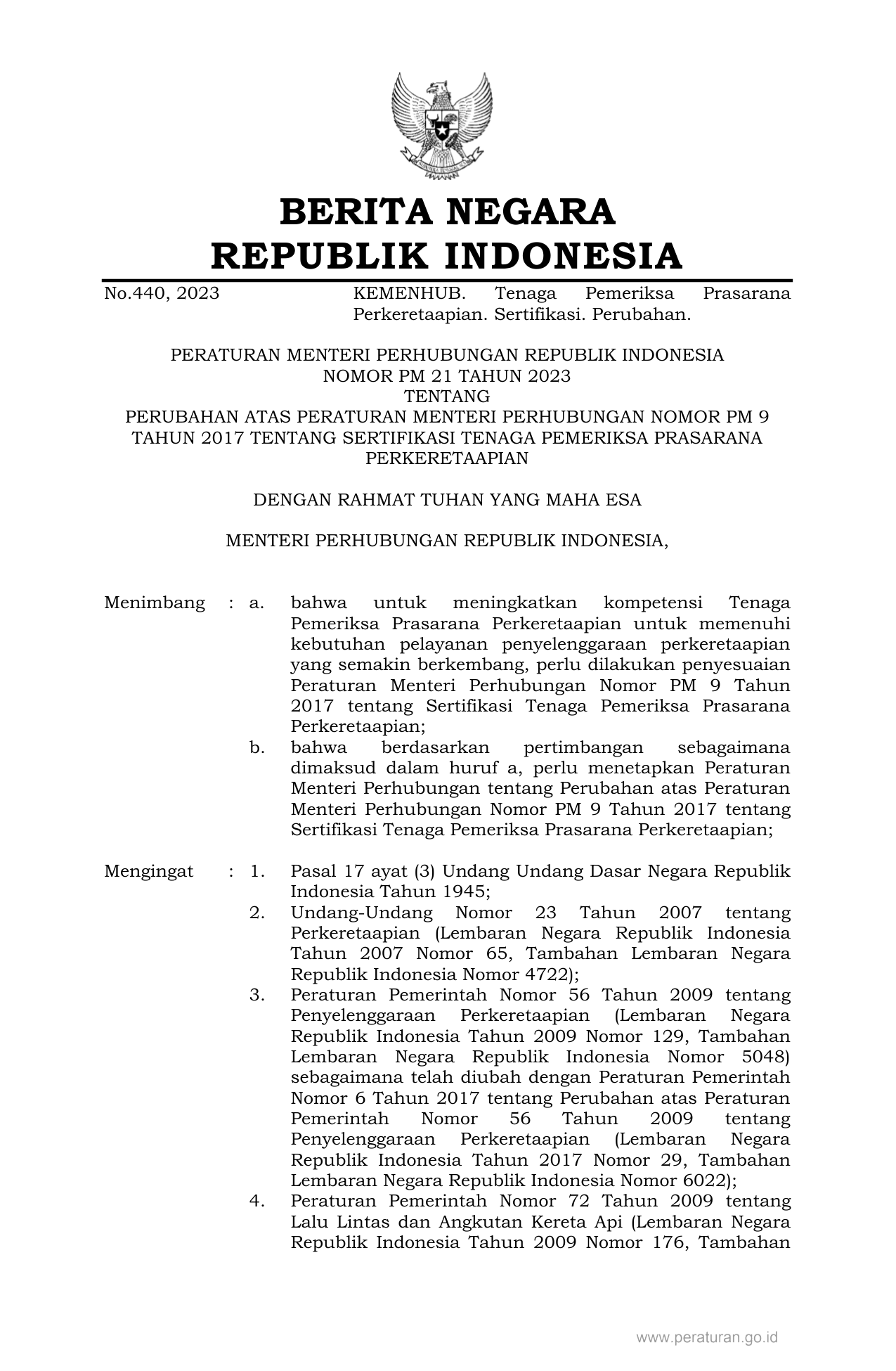 PERMEN Nomor pm-21 Tahun 2023 | Peraturan Menteri Nomor pm-21 Tahun 2023 tentang PERUBAHAN ATAS PERATURAN MENTERI PERHUBUNGAN NOMOR PM 9 TAHUN 2017 TENTANG SERTIFIKASI TENAGA PEMERIKSA PRASARANA PERKERETAAPIAN