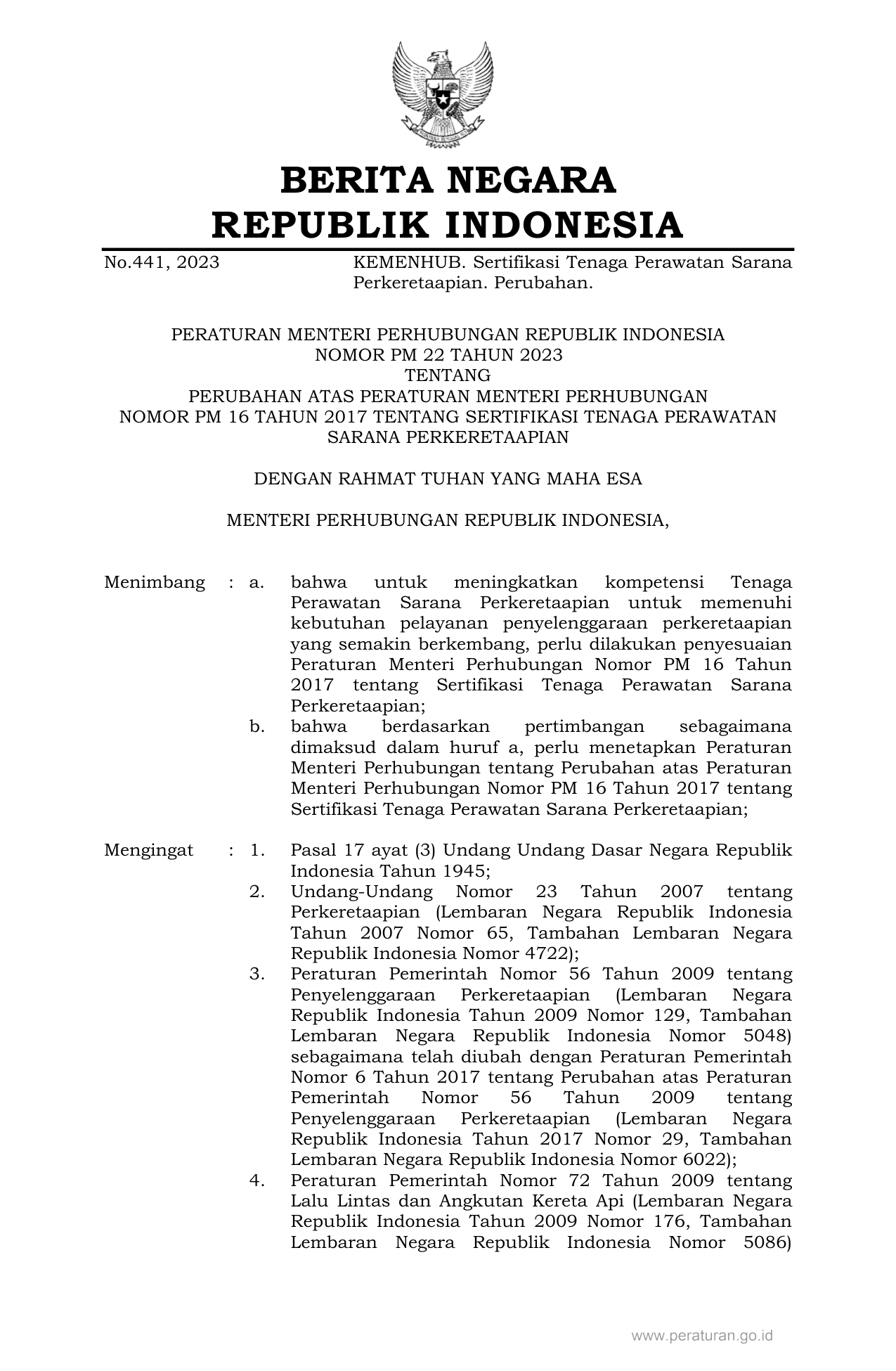 PERMEN Nomor pm-22 Tahun 2023 | Peraturan Menteri Nomor pm-22 Tahun 2023 tentang PERUBAHAN ATAS PERATURAN MENTERI PERHUBUNGAN NOMOR PM 16 TAHUN 2017 TENTANG SERTIFIKASI TENAGA PERAWATAN SARANA PERKERETAAPIAN