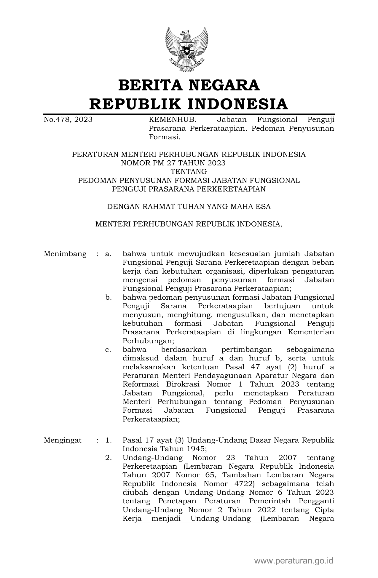 PERMEN Nomor pm-27 Tahun 2023 | Peraturan Menteri Nomor pm-27 Tahun 2023 tentang PEDOMAN PENYUSUNAN FORMASI JABATAN FUNGSIONAL PENGUJI PRASARANA PERKERETAAPIAN