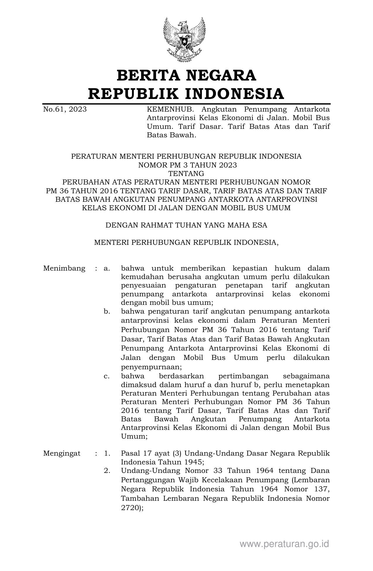 PERMEN Nomor pm-3 Tahun 2023 | Peraturan Menteri Nomor pm-3 Tahun 2023 tentang PERUBAHAN ATAS PERATURAN MENTERI PERHUBUNGAN NOMOR PM 36 TAHUN 2016 TENTANG TARIF DASAR, TARIF BATAS ATAS DAN TARIF BATAS BAWAH ANGKUTAN PENUMPANG ANTARKOTA ANTARPROVINSI KELAS EKONOMI DI JALAN DENGAN MOBIL BUS UMUM