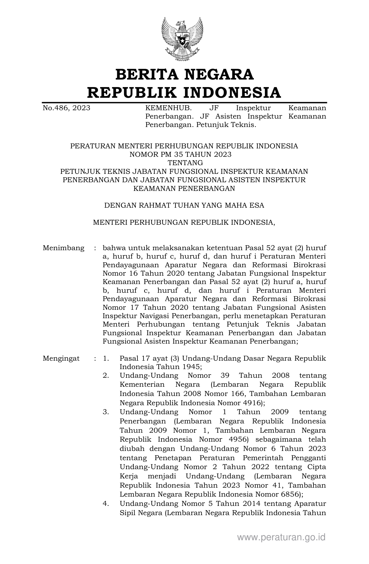 PERMEN Nomor pm-35 Tahun 2023 | Peraturan Menteri Nomor pm-35 Tahun 2023 tentang PETUNJUK TEKNIS JABATAN FUNGSIONAL INSPEKTUR KEAMANAN PENERBANGAN DAN JABATAN FUNGSIONAL ASISTEN INSPEKTUR KEAMANAN PENERBANGAN