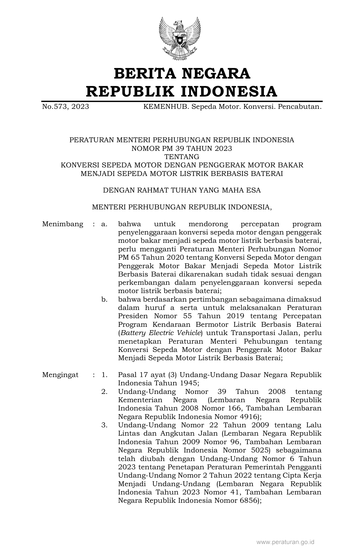 PERMEN Nomor pm-39 Tahun 2023 | Peraturan Menteri Nomor pm-39 Tahun 2023 tentang KONVERSI SEPEDA MOTOR DENGAN PENGGERAK MOTOR BAKAR MENJADI SEPEDA MOTOR LISTRIK BERBASIS BATERAI