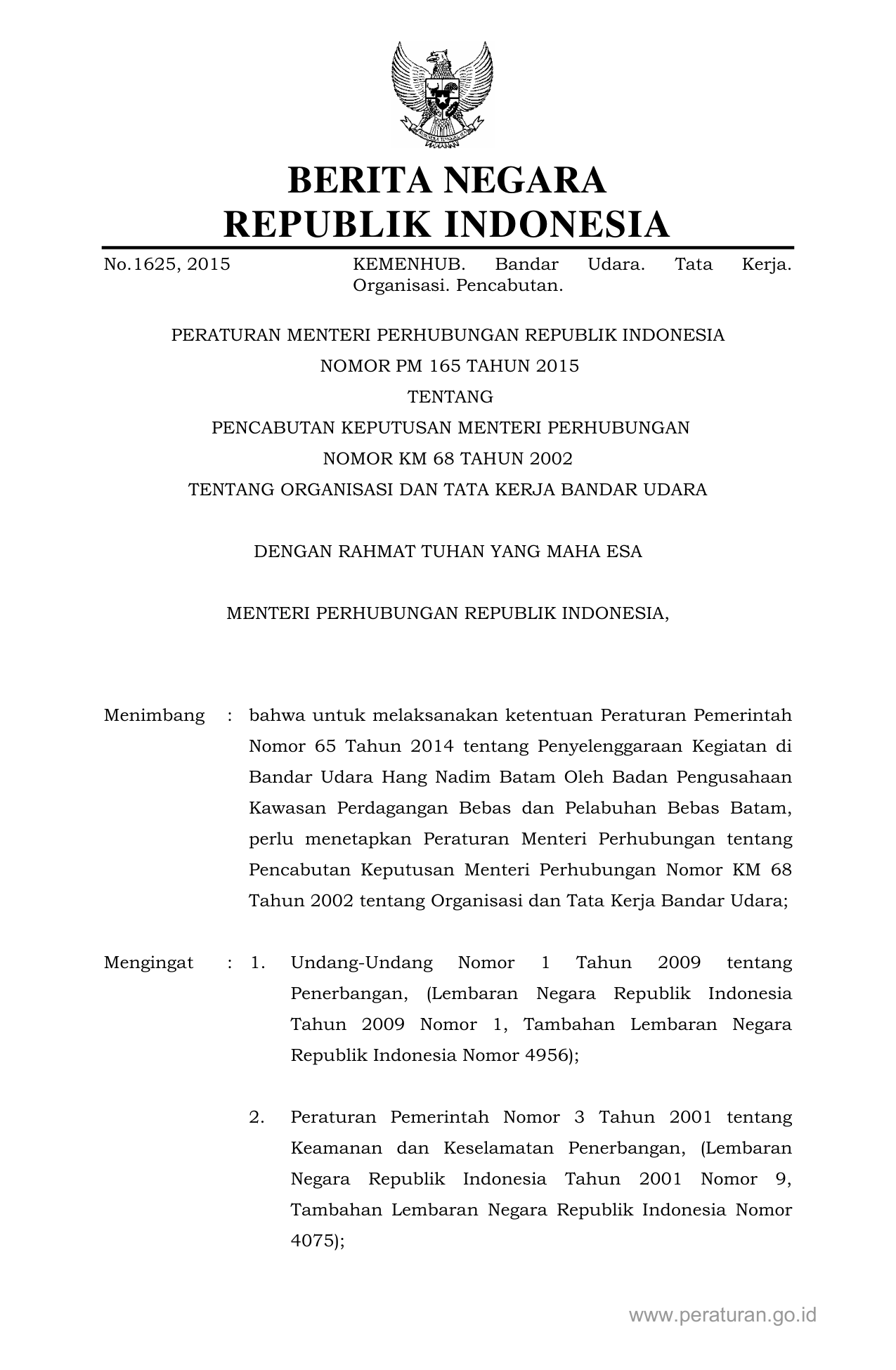 PERMEN Nomor pm165 Tahun 2015 | Peraturan Menteri Nomor pm165 Tahun 2015 tentang PENCABUTAN KEPUTUSAN MENTERI PERHUBUNGAN NOMOR KM 68 TAHUN 2002 TENTANG ORGANISASI DAN TATA KERJA BANDAR UDARA
