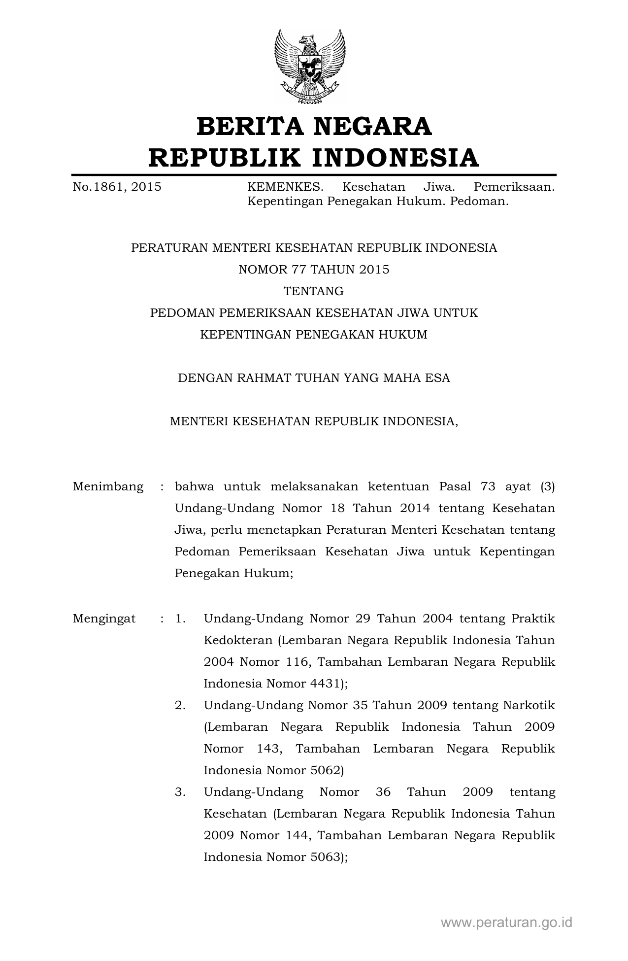 PERMEN Nomor 77 Tahun 2015 | Peraturan Menteri Nomor 77 Tahun 2015 tentang PEDOMAN PEMERIKSAAN KESEHATAN JIWA UNTUK KEPENTINGAN PENEGAKAN HUKUM