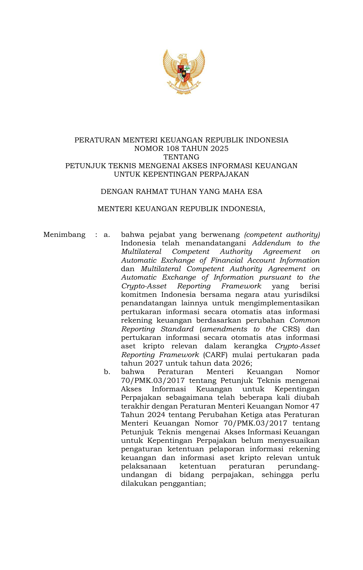 PERMEN Nomor 108 Tahun 2025 | Peraturan Menteri Nomor 108 Tahun 2025 tentang Petunjuk Teknis Mengenai Akses Informasi Keuangan Untuk Kepentingan Perpajakan