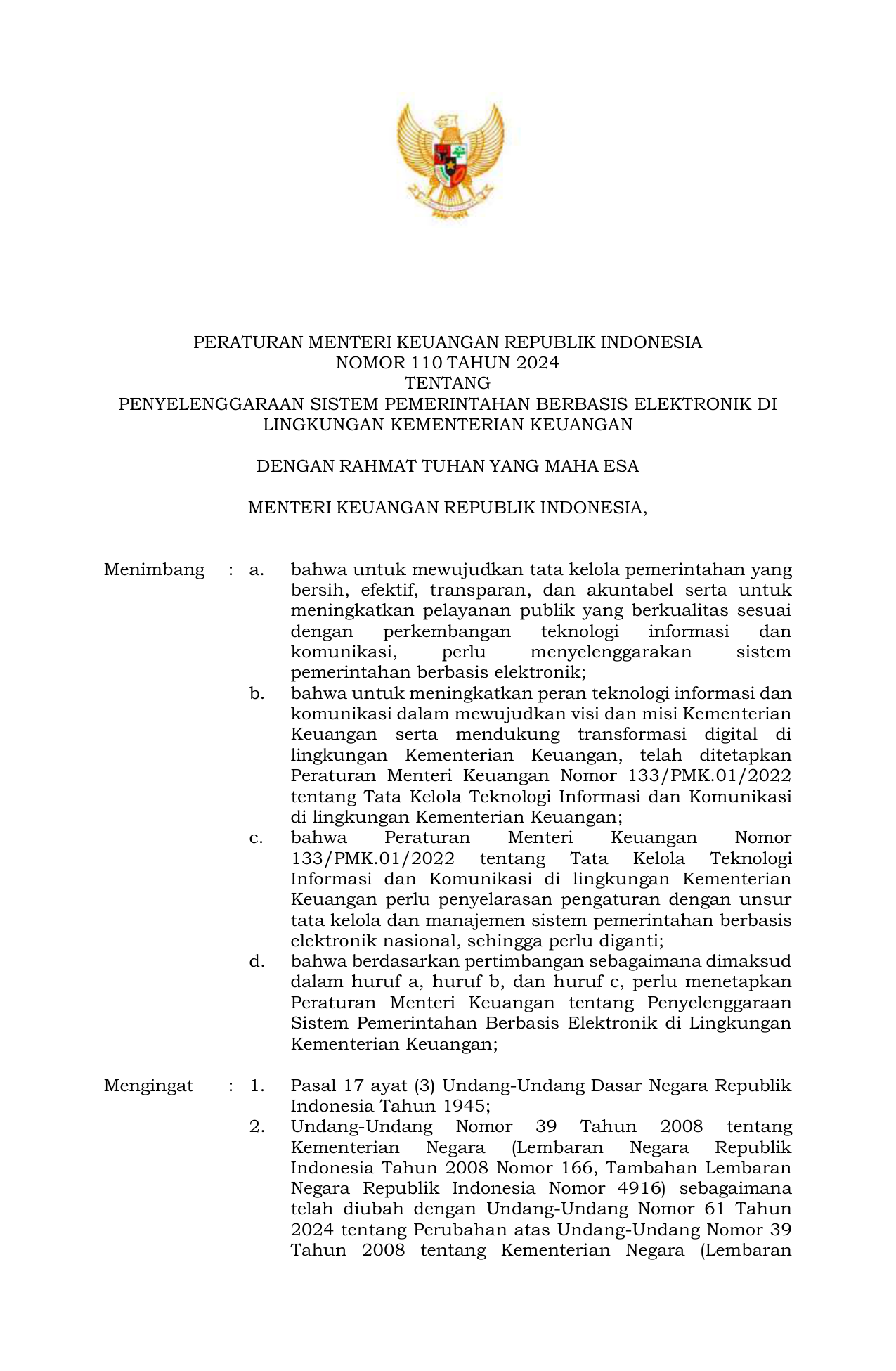 PERMEN Nomor 110 Tahun 2024 | Peraturan Menteri Nomor 110 Tahun 2024 tentang Penyelenggaraan Sistem Pemerintahan Berbasis Elektronik di Lingkungan Kementerian Keuangan