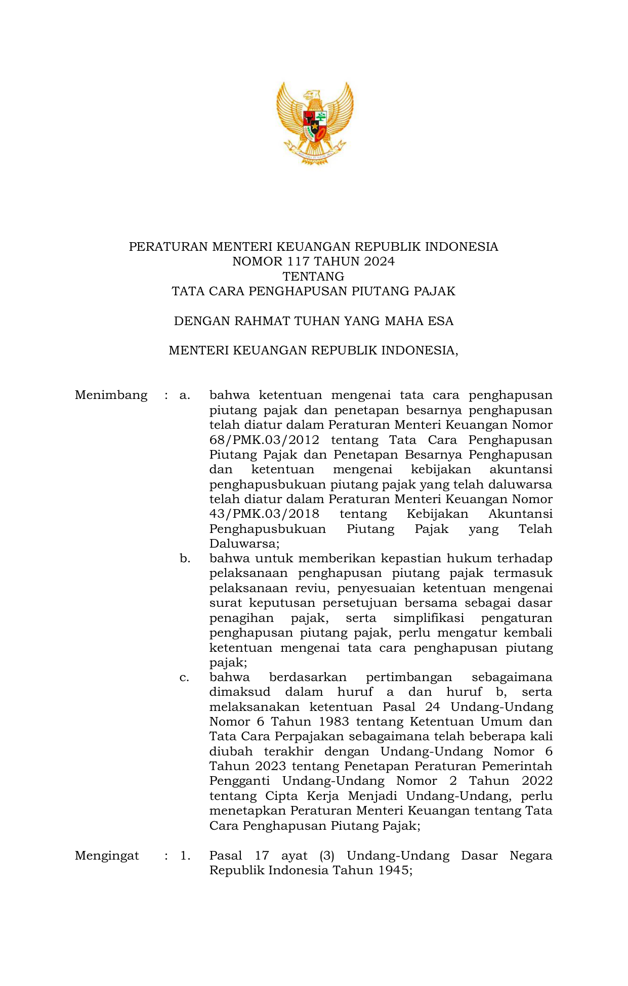 PERMEN Nomor 117 Tahun 2024 | Peraturan Menteri Nomor 117 Tahun 2024 tentang Tata Cara Penghapusan Piutang Pajak